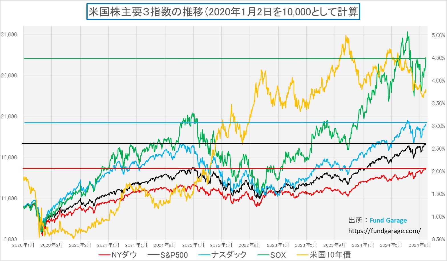 下のチャートを見て頂きたいのだが、これは新型コロナウイルスの感染拡大が始まる前の2020年1月2日を起点としたアメリカの主要株価指数(フィラデルフィア半導体指数ことSOX指数を含む)と米国債10年債の利回りを示したものだが、長期金利がほぼ一貫して上昇する中で、株価の上昇トレンドは続いてきたが、特に加速した時期は、2022年の終わりからだ。取分けその流れをリードしたのがSOX指数だが、そのメインは言うまでもなくエヌビディア(NVDA)だ。一番パフォーマンスが悪いのがNYダウ、何故なら景気敏感セクターの物や、金融関連銘柄が含まれるからだ。そしてそのリード役だったSOX指数が、ここ暫くはもたついていることも、為替動向などを読む上では、重要なポイントなるであろう。要は「第四次産業革命」であるAIのこの先の流れをどう読むかだ。何れにしても、米国企業、取分けAIに絡んだハイテク産業が強いことが、ドル需要を生み続けていると捉えると、全てのチャートの流れを容易に理解することが出来る。ならば、日本にそれらに匹敵する投資対象があるかと言えば、「代理店」の類いはあるかも知れないが、何もない。事実、難しく考えるまでもなく、身の回りに純日本製のITガジェットは、私の場合は皆無だという事が何よりの証左でもある。