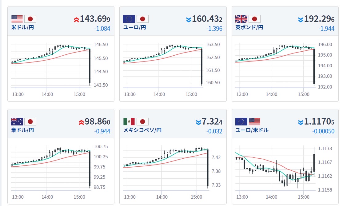 一方、二国間の通貨交換のレートをリアルタイムで示す為替相場の動きはというと、この自民党総裁選の結果が報じられた直後から、一気に「円高」に振れた。これはFund Garageの公式YouTubeチャンネルでお馴染みの勝癸ユウからほぼリアルタイムで送られてきた画像で、状況の一変振りが明確に分かるものなのでご紹介するが、驚くほど見事に全てが「円高」に動いている。どのチャートを見ても、一番右側に真っ直ぐに下がる大陰線が描かれているが、これは誤植でもなんでもなく、一気に円が買われたことを示している。