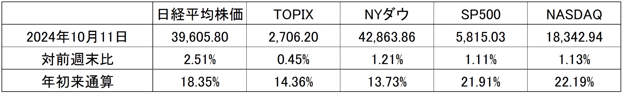 前振りが長くなってしまったが、この日本の現状で、先週末の日経平均株価が39,605円と、再び4万円台に到達しようとしていることが正直どうしても納得出来ていないというよりも、今にも大崩れする可能性を強く感じていることをお伝えしておきたかったからだ。ただ、当然それは間違った見立てであることもあるし、このまま7月11日の史上最高値42,224.02円をつけに行くようにヘッジファンドなどが市場マニピュレーション(市場操作)を仕掛けてくるかも知れない。実際、この日経平均株価というものは、ある程度の資金量があれば、意図的に操作をすることが意図も容易い株価指数でもあるからだ。まずは先週の日米株式市場の騰落率を確認しておこう。下記の表に目を通して欲しい。