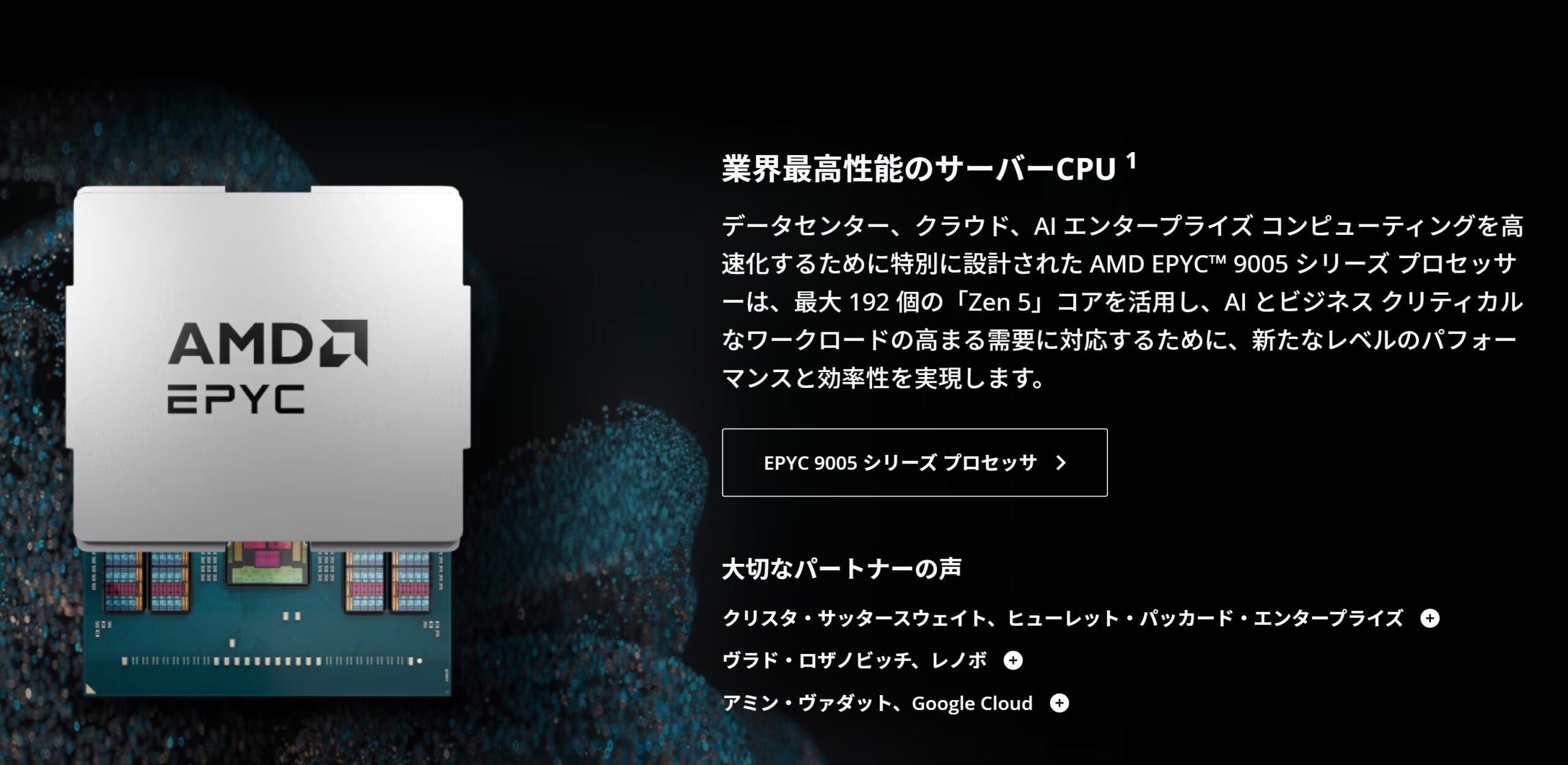 中には「AMDは、CEOのリサ・スー博士と彼女のチームが2025年までの45億ドルのAI収益予測や見通しを上方修正しなかったため、投資家がネガティブな反応を示し、この日の取引で4%下落した」というような評価もあるが、問題はそこには無いと思われる。まずAMD自体が、Webページなどの構成状況を見て貰えば一目瞭然なのだが、NVIDIAのGPUとガチンコ勝負のGPUアクセラレーターであるInstinct MI325X GPUをトップには押し出していない。一番はAMD EPYC 9005 シリーズ プロセッサーなのだ。下の写真が示すように、AMD は、EPYC 9005 シリーズをクラウド、エンタープライズ、AI 向けの世界最高の CPU と呼んでいる。またMeta Platforms のインフラストラクチャおよびエンジニアリング担当副社長である Kevin Salvadore 氏がイベントで、同社が 150 万個を超える EPYC CPU を導入したと発表し、既に市場で反響を呼んでいることをアピールしている。そう、何故なら、競合他社はあのインテル(INTC)だからだ。既にAMDはインテルのサーバーCPUの市場シェアを奪っているので、もしかするとAMDの現在の主戦場はこちらなのかも知れないと訝しんでしまうほどだ。