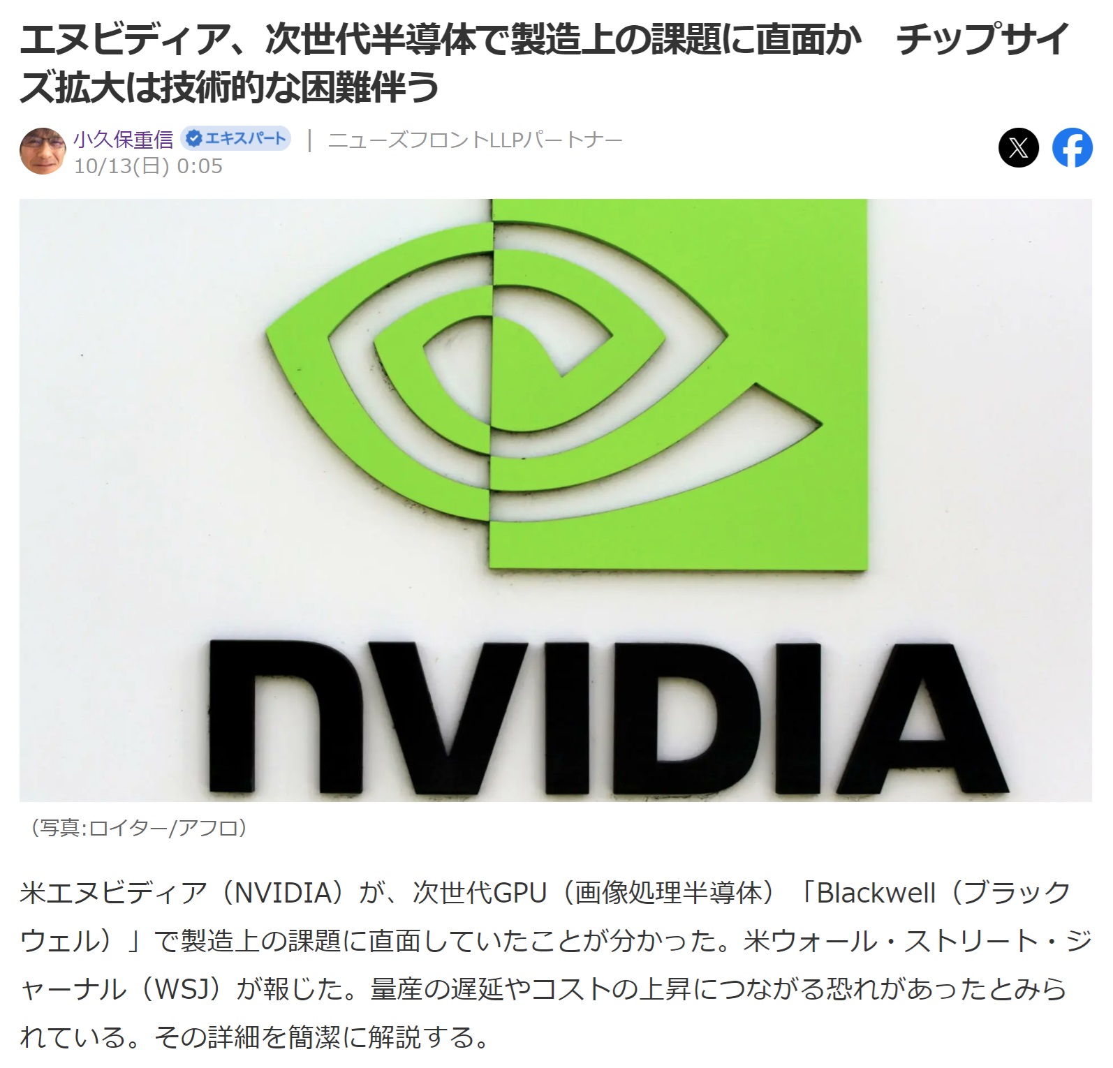 これは蛇足だが、例えば「エヌビディアのBlackwellには設計上のミスがあって、製造が止まって、出荷が遅延している」と未だに考えている方が時々いらっしゃることに驚きを感じたことがあるのだが、図らずも、その理由が分かった。それは、それこそSNSの発達や、ネット・ニュースの普及によって、結構「ヤバい」ほどの時間軸のズレを混在させた情報が、そこかしこに点在しているという事だ。その典型例がこの下のネット上の記事。この記事の見出しを見て、更に本文の出だしを見れば、誰もが「エヌビディアのBlackwellは製造が遅れるんだ」と思わざるを得ないだろう。もし、日本語を正確に使うのならば、「エヌビディア、次世代半導体で製造上の課題に直面していたが(克服)」とすべきだと思うが、これこそ「アテンションエコノミーの最たるものかも知れない」。この記事の配信時間は10月13日の深夜0:05。つまり日曜日の早朝だ。そしてあたかも「WSJ誌が報じた」と信憑性を高めようとしている。このWSJ誌の記事は8月30日に報じられたもので、その後にいろいろ追加情報出て、ジャンセンCEO自ら「問題は解決した」ということも発表し、今に至っている。
