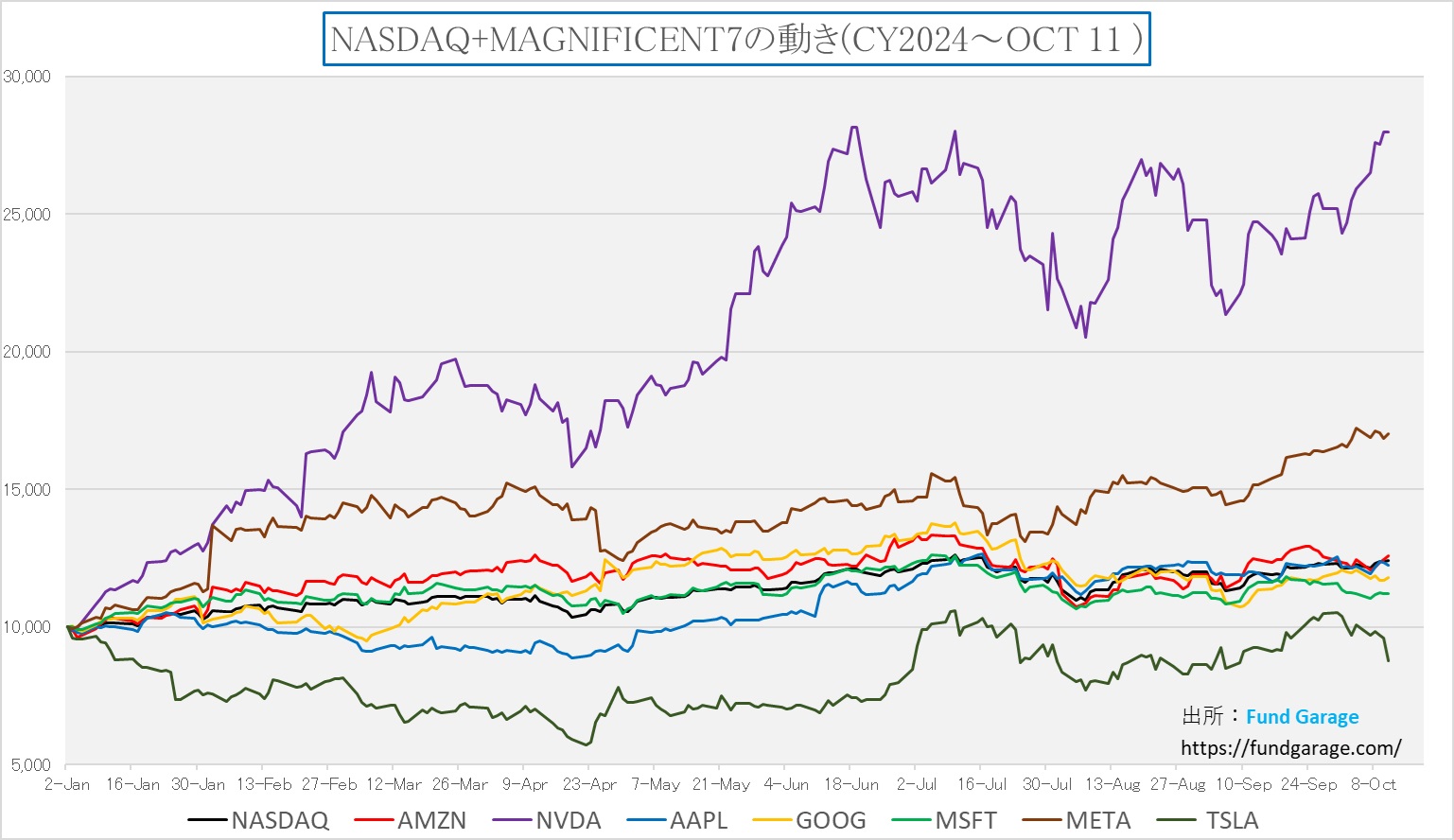 下のチャートは2024年初めから先週末11日までの「マグニフィセント7」各社とNASDAQのパフォーマンスを見たものだ。黒い線で示したNASDAQも年初来では+24.22%の上昇となっているのだが、紫色のエヌビディアが+279.85%と、凡そ約3倍にもなっていることから、あまり値上がりしているようにも見えないかも知れない。でも、冷静に考えれば+24.22%のパフォーマンスは、それだけでも実に素晴らしい成果だ。第2位は茶色で示したメタプラットフォームズで+170.36%で概ね約2倍。どちらもとてつもないパフォーマンスだ。一方、最下位にあるのは深緑で示したテスラで、これは年初来マイナス△12.33%。これらを十把一絡げに「マグニフィセント7」と括ることには、既にかなりの違和感がある。