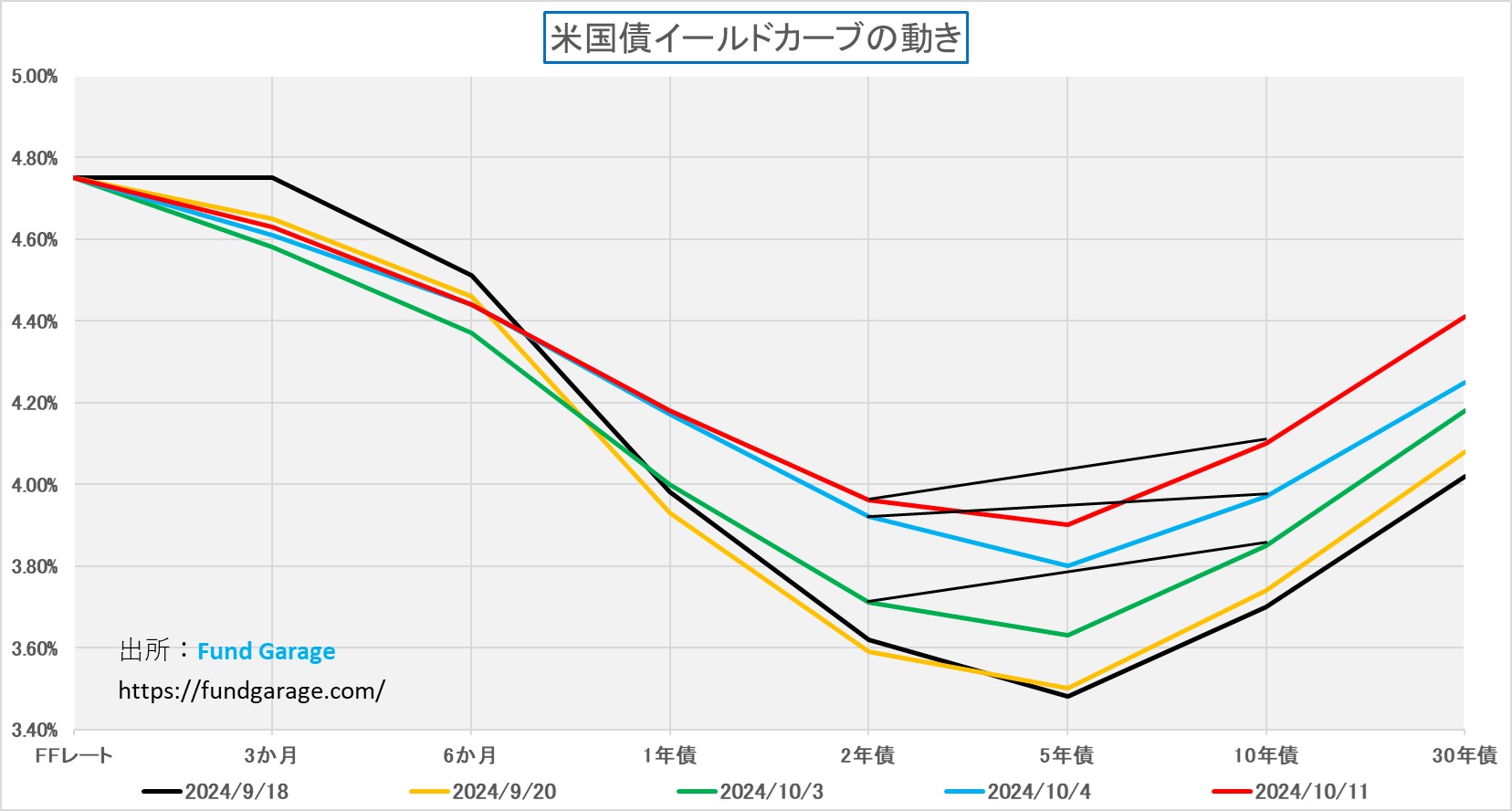 相変わらずメディアの市場解説を聞いていると、「FRBはいつ、何%の利下げをするか」或いは「0.25%の利下げか、0.50%の利下げか」という話に終始しているかのように伝えてくるが、実際の米国債現物市場は確りと長期金利の上昇で応えている。当初、漸く2年債利回りと10年債利回りの間で「順イールド」化が進み始めているようだったが、先週は更にそれが進んだだけでなく、10年債利回りは遂に4.10%にまで上昇して一週間を終えている。下のチャートは、9月のFOMCがあった9月18日とその週末、雇用統計の発表前後、そして先週末のイールドカーブを示すが、前回以上に「逆イールド」の状態よりフラットニング化している。これは朗報なのだが、未だに「金利が上昇したので、株価が下落した」とコメントするコメンテーターやニュース報道は多い。だが、実際には前週末に比べて、金利は水色の10月4日から赤色の10月11日へと見事に上昇している。そして週を通じて見ると、「元気な日経平均株価」程ではないが、米国株主要三指数は揃って上昇している。