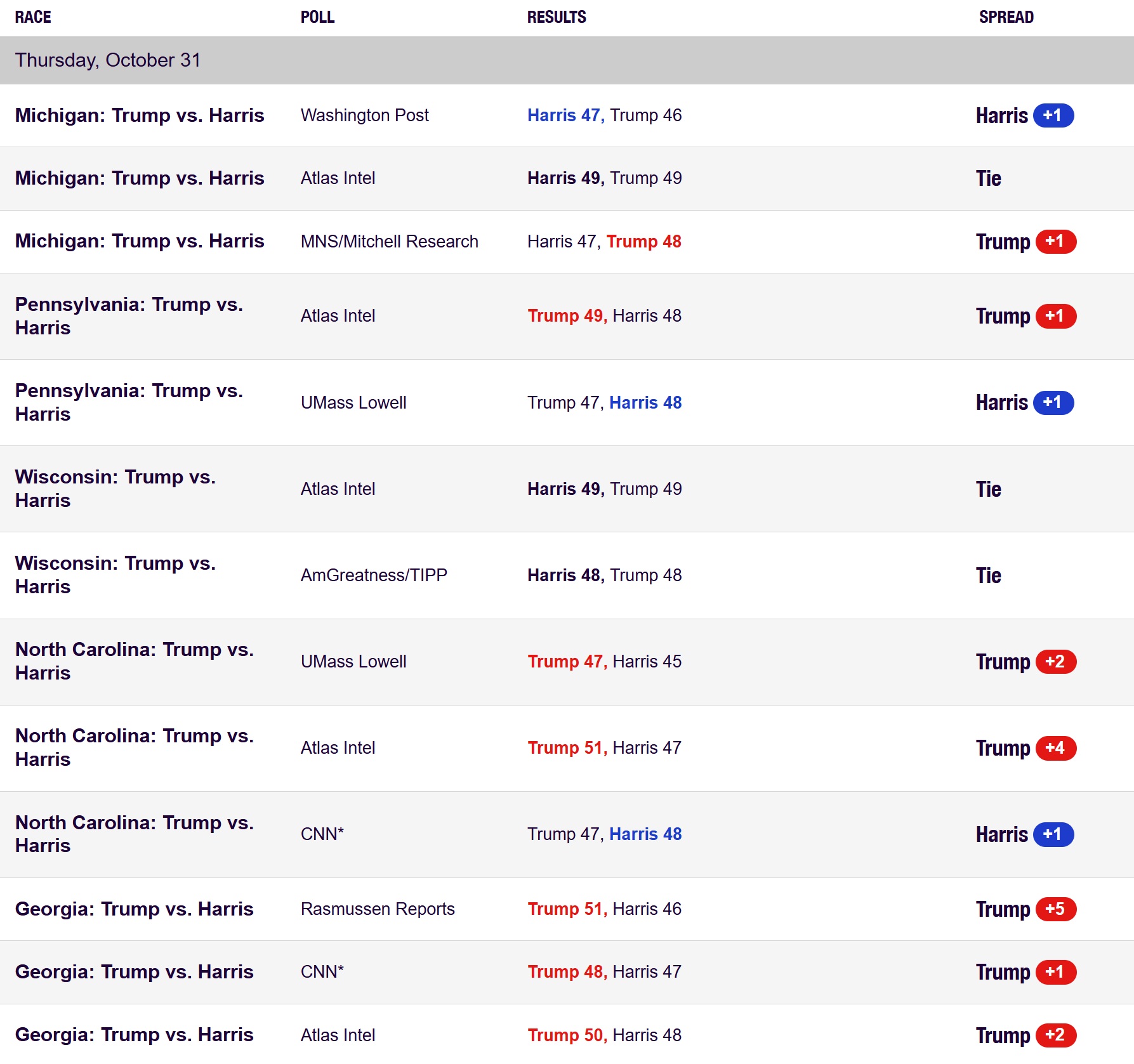 ※上からミシガン州、ペンシルベニア州、ウィスコンシン州、北カリフォルニア州、ジョージア州と激戦州が並んでいる。この下のアリゾナなども並ぶ