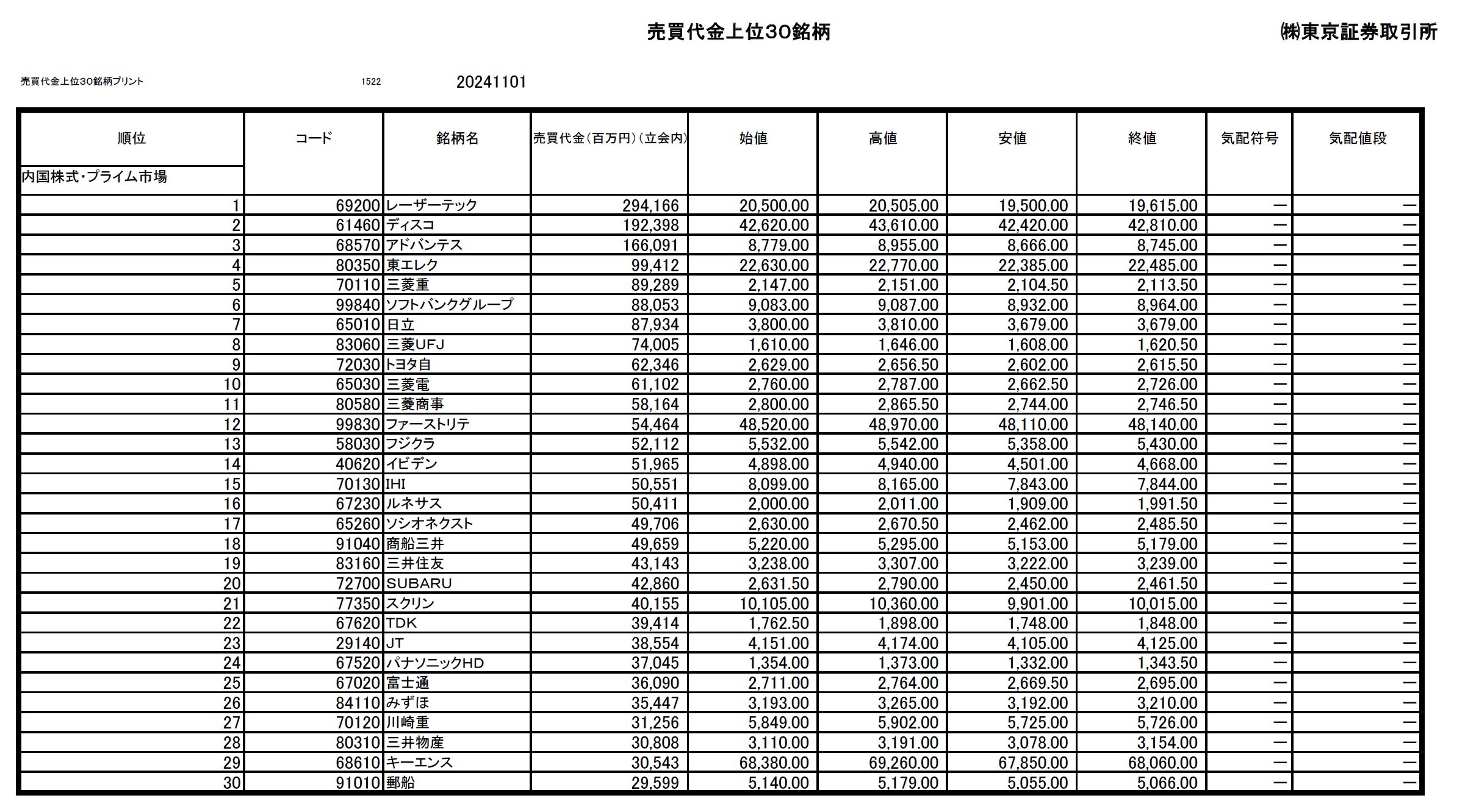 東証プライム市場で頻繁に一日の売買代金トップにさえ立つことがあるレーザーテック(6920)。その決算が発表になった翌日11月1日には約17%安まで売り込まれた。原因としては純利益が市場予想の186億円に対して、僅か89億円となったことが原因だと解説されているが、直近四半期の売上高が僅か367億円、純利益が89億円規模の会社の一日の売買代金が2,941億円にもなる東証プライム市場の歪さにまずは驚きを禁じ得ない。下の表は東証が発表している先週末11月1日の東証プライム市場の売買代金”列伝”だが、上位4銘柄を半導体製造装置メーカーが占める。そのトップがレーザーテック(6920)ということになる。次席のディスコ(6146)も売買代金が1,924億円と2/3に減少するが、ディスコも直近四半期の売上高が962億円、純利益が297億円程度の規模の会社に過ぎない。(※参考までに第9位にランクされているトヨタ自動車(7203)の前四半期(直近はまだ未発表)の売上高は連結ベースで11兆8,379億円、純利益が1兆3,638億円)