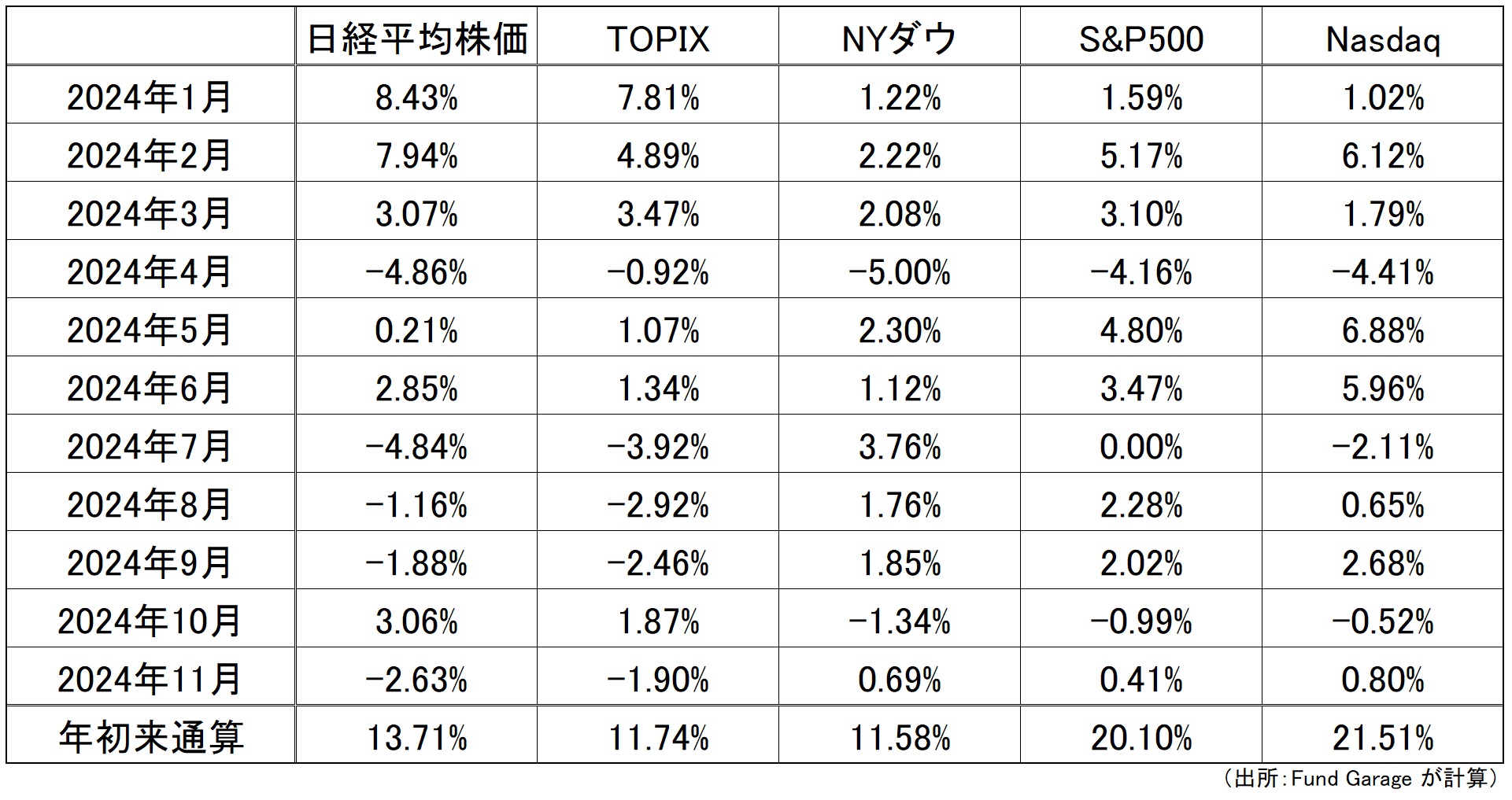 従って、ちょうど月末を超えたこともあり、月次の騰落率も確認しておきたい。2024年11月とある分は、先週末11月1日だけでしか無いので10月分までが月次騰落率ということになるが、総じて今年も米国市場の方がパフォーマンスが良いまま終わりそうだ。更に言えば、やはりテック系グロース銘柄が多いNASDAQが一番成績が良い。そしてもうひとつ面白いことは、結局日本株は今年2月時点の水準(約38,000円前後)から上にも下にも抜けきれず、ウロウロしたままだということ。それすなわち「主役」が誰もいないからだろう。米国ハイテク市場に振り回され、為替相場に振り回され、そして政治に振り回されるだけ。投資の根源的な価値である企業収益ではなく、周りの広義「マクロ」に振り回されているだけでしかない。