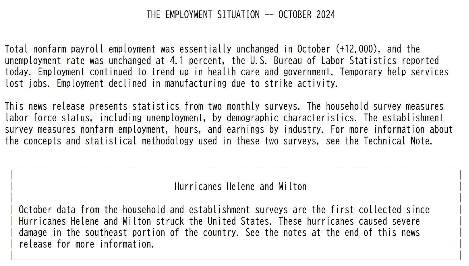 また下の原文の後半で明らかな通り、「ハリケーン・ヘレンとミルトン」と題して、囲い付きで「10 月の世帯および事業所調査データは、ハリケーン ヘレンとミルトンが米国を襲って以来初めて収集されたものです。これらのハリケーンは、米国南東部に甚大な被害をもたらしました。詳細については、このニュース リリースの末尾の注記を参照してください。」とまで注意書きを入れている。