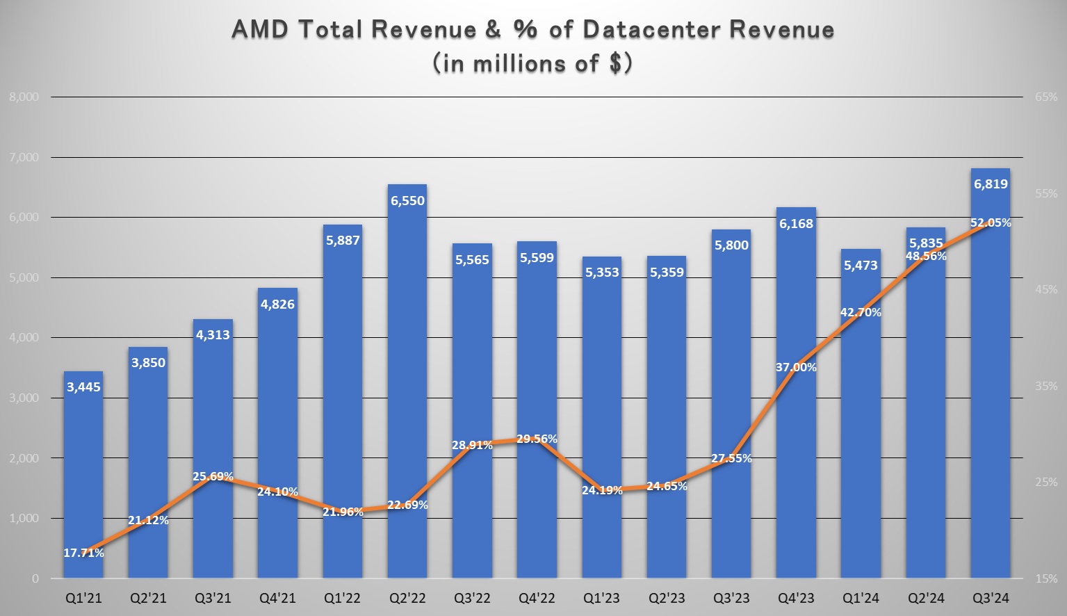 ただデータセンタ向けサーバー用途のCPUであるEPYCに関しても、もうひとつクライアントセグメントに含まれるパソコン向けCPUのRyzenシリーズも、共に汎用コンピューティングの世界では競合インテルが失速していることも追い風となって、市場シェアを拡大し続けている。一方で、コンソール型ゲーム機器(XboxやPlaystation)が機種切り替えの狭間で完全に失速しており、データセンタ向け事業が好調に伸びても、全体では勢いが見えなくなるということも言える。下のチャートは、総売上の推移と、データセンタ向け売上の比率を示したもの。下の図で分かる通り、データセンタ向けはYoYでRevenueが+122%、ClientもYoYで+29%となっているが、GamingとEmbeddedは失速しているのが明らかだ。Embeddedは買収したザイリンクスのFPGA部門だが、近時の自動車販売の不調が影響している。ただ、それこそ今後自動運転車やエッジAIが立ち上がってくれば、当然FPGAは恩恵を受けることが期待出来る。