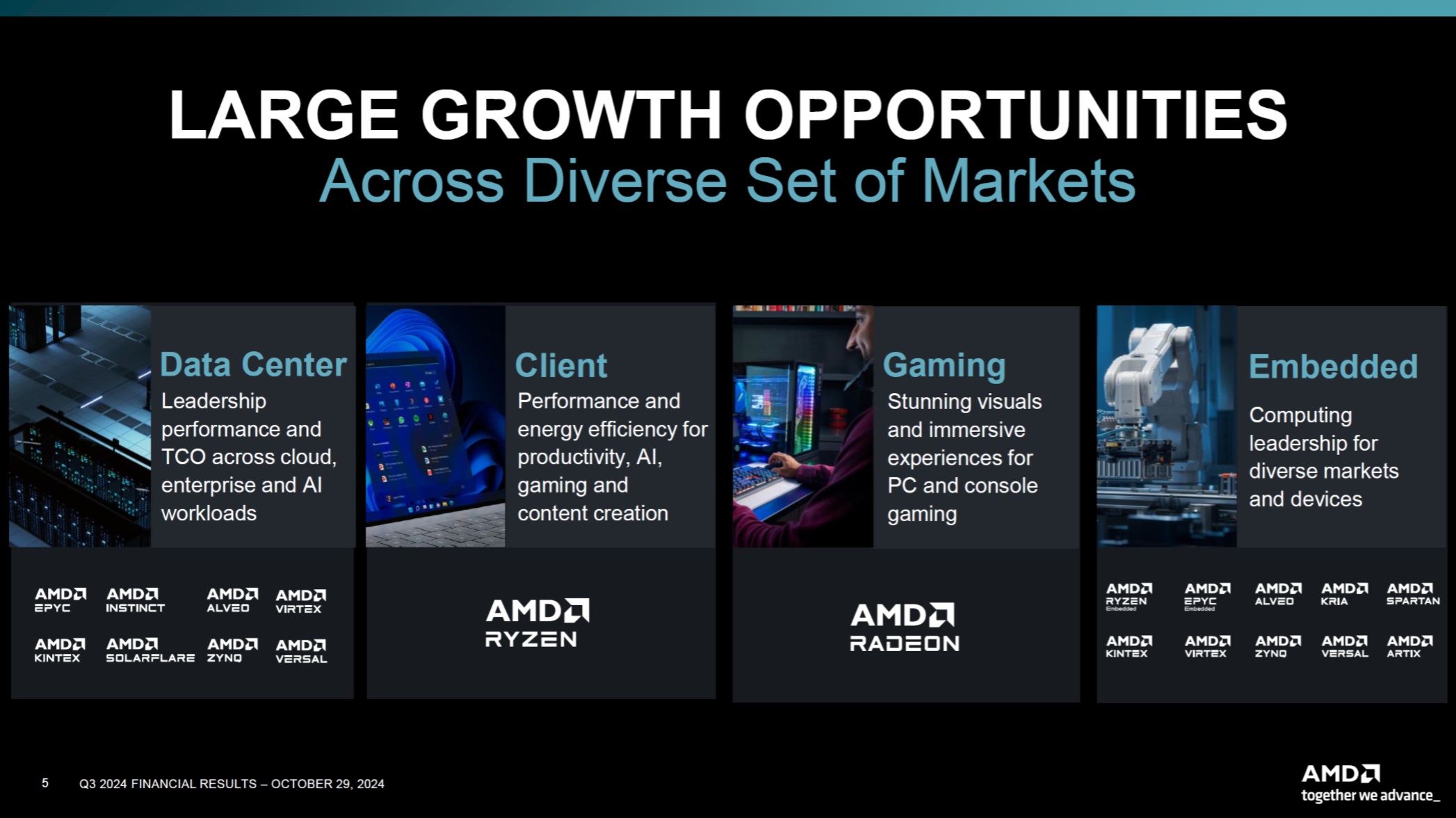 AMDはMI300Xなどの新世代データセンター向けGPUが成長を牽引しており、特にMetaやMicrosoftとの提携により、AIモデルのトレーニングやインフェレンス(推論)処理をサポートしている。さらに、EPYCプロセッサがクラウドとエンタープライズ向けに採用され、TCO(Total Cost of Ownership:総所有コスト)削減と高性能化を実現している。AIやデータセンター市場での成長が顕著で、供給制約に対応しつつAI関連ハードウェアへの強力な投資が続く。