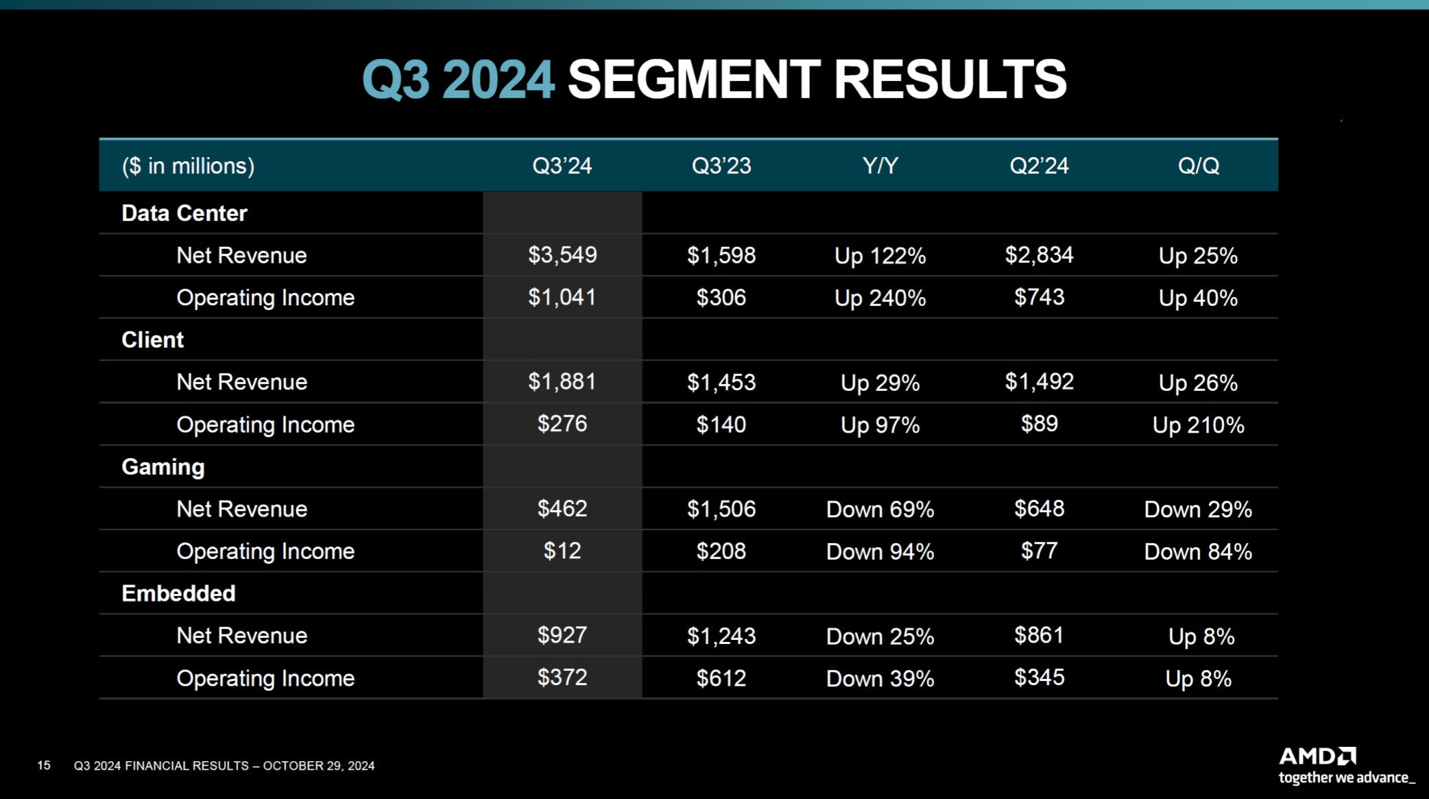 - クライアント部門:収益は19億ドルで、前年同期比29%の成長。最新のZen 5デスクトップおよびノートブックプロセッサの需要が高まったことが要因。