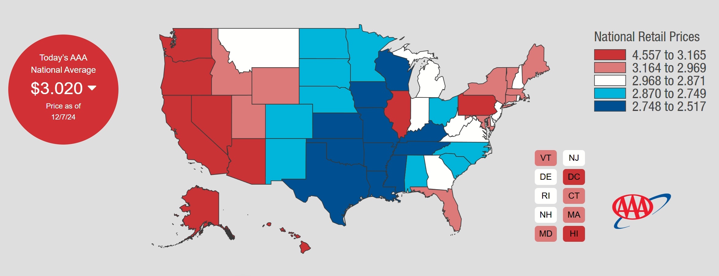 全米のガソリン価格が低下している。これについてAAA ガソリン価格ウェブサイトでは、「氷河が海に向かってゆっくりと進むように、ガソリン1ガロンあたりの全米平均価格は3ドルの水準に近づきつつあり、先週から3セント下がって3.03ドルとなっています。価格の下落は不安定で、非常にゆっくりとしたペースであり、1ヶ月以上にわたって3ドルまであと10セントにも満たない水準で推移しています。全米平均価格が3ドルを下回ったのは2021年5月11日が最後でした。一方、公共EV充電ステーションでの電力1キロワットあたりの全米平均価格は、今日も34セントのままとなっています。」と表現して、状況を伝えている。