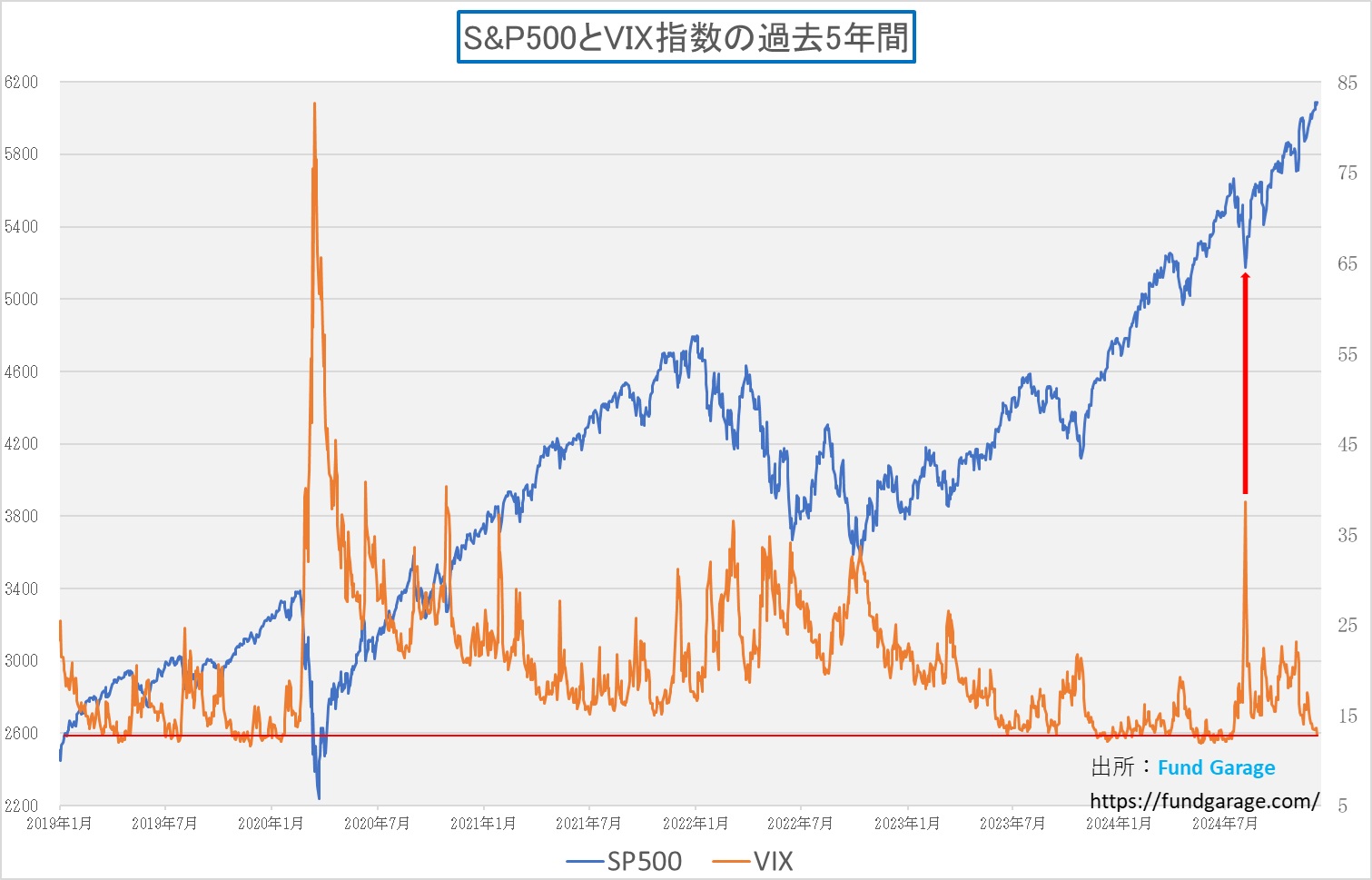 一つ目は、前回もお伝えした、S&P500のインプライド・ボラティリティである恐怖指数(VIX指数)が、更に低下しているということ。下のチャートは過去5年間のS&P500と恐怖指数の推移をみているが、どう見ても、最低値の水準にまで低下してきたことは、紛れもない事実だ。そして過去はこの状態を改善するために、いつも株価が程度の違いあれども急落してきた。Covid-19のパンデミックの時は、事前に「怪しくなってきたぞ」という危機感が、最低限、新型コロナウイルスの感染拡大に伴って拡がっていったので、結果的には「さもありなん」と思ったが、今年の7月の時の株価急落と恐怖指数の急騰は「日銀が利上げ」をしたからであり、如何に市場がナーバスになってきているのかということを如実に伝える結果であった。それは日本の景気の大失速だ。日本が先に「メルトダウン」を起こして、米国市場もこれにつられた。
