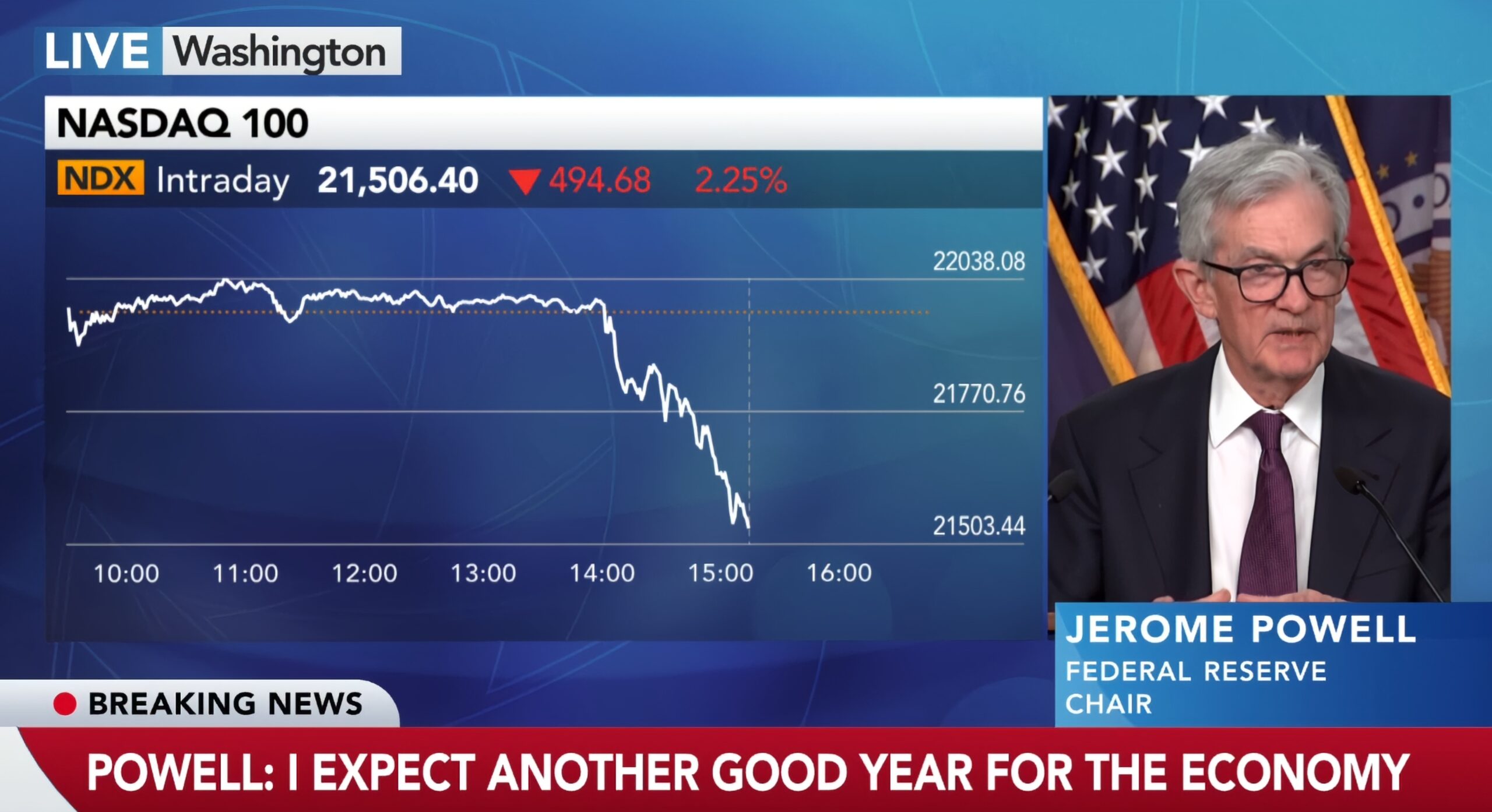 株式市場はこのパウエル議長の記者会見を聴きながら、急落していった。下の写真はBloombergニュースがライブ中継している記者会見中のスナップショットだが、注目して欲しいのは、NASDAQ100が既に△2%を超えて下落している傍らで、Breaking Newsとしてパウエル議長のコメントを引用している部分には、「POWELL:I EXPECT ANOTHER GOOD YEAR FOR THE ECONOMY(私は来年も経済はいい年になると期待している)」とあることだ。リアルタイムで聴いていて、パウエル議長は米国景気の見通しについては非常にポジティブであることが伝わってきていた。なので、その反面で株価指数が急落しているのを見て、「システムやアルゴリズム取引の条件反射だな」と理解していた。