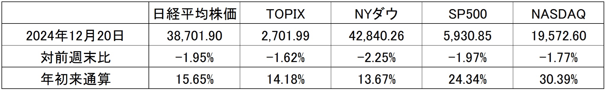 何れにしても、こうした流れを受けて、先週の日米株式市場の騰落率は下記のような状況になった。利下げ期待が先行して上昇してきたNYダウにとっては、FOMCで利下げが無かった以上、指数が下落するのは仕方が無いことだ。ただ一方の日本株、日銀が利上げしないことを発表し、更に円安が加速したというのに、米国株の動きに足を引っ張られるかのように、米国株並みに下落したのは、やや腑に落ちない。また週末20日の東京株式市場、日経平均株価は僅か前日比で111円68銭(0.29%)安となったに過ぎないが、発表された当日の東証プライムの売買代金が5兆7153億円と今月最大に膨らんだというのも不思議だ。12月に入ってからは概ね3兆円台の水準だったものが、先週は4兆円台前半が火曜日から3日間続き、金曜日にいきなり6兆円近い規模に膨らんでいる。12月20日は米国市場で株価指数先物、株価指数オプション、個別株先物、個別株オプションの4つのデリバティブ商品の満期が同時に到来するメジャーSQ(クアドルプルウィッチング)でもあり、これに絡んでの売買高急増であるなら、この先の日本市場の動きに変化が出るかも知れないので要注意だ。現時点、この要因については明確な答えは見つからない。
