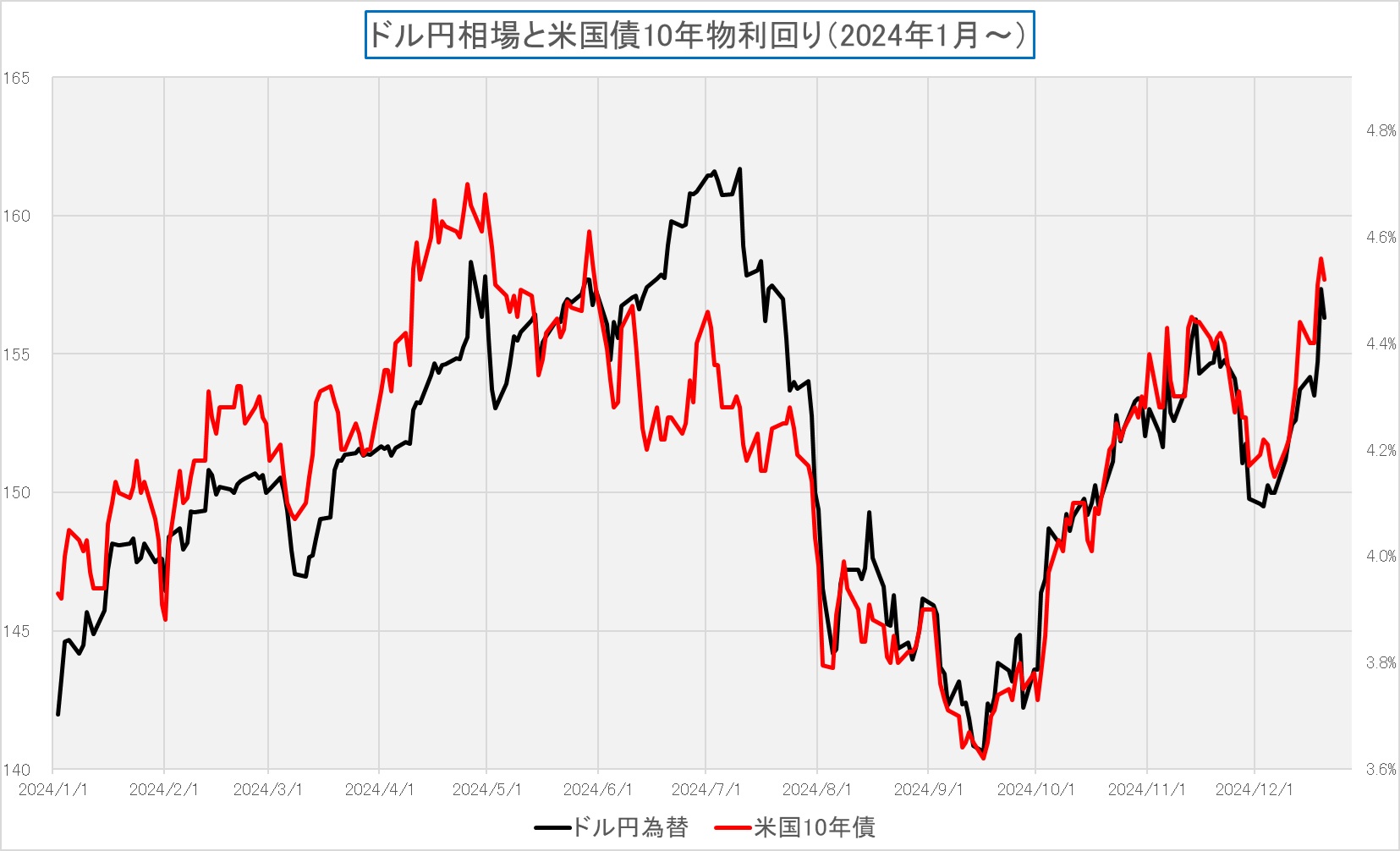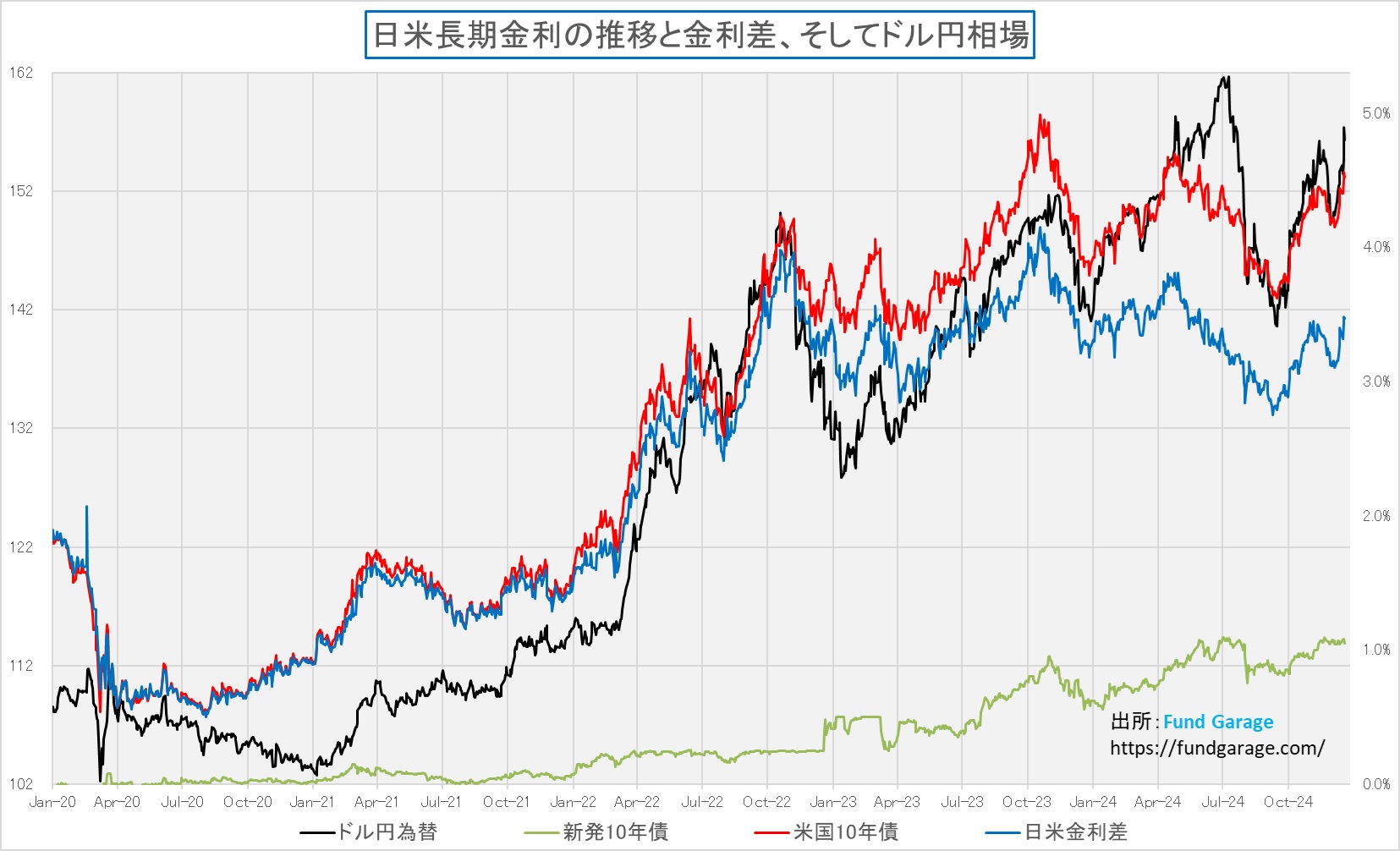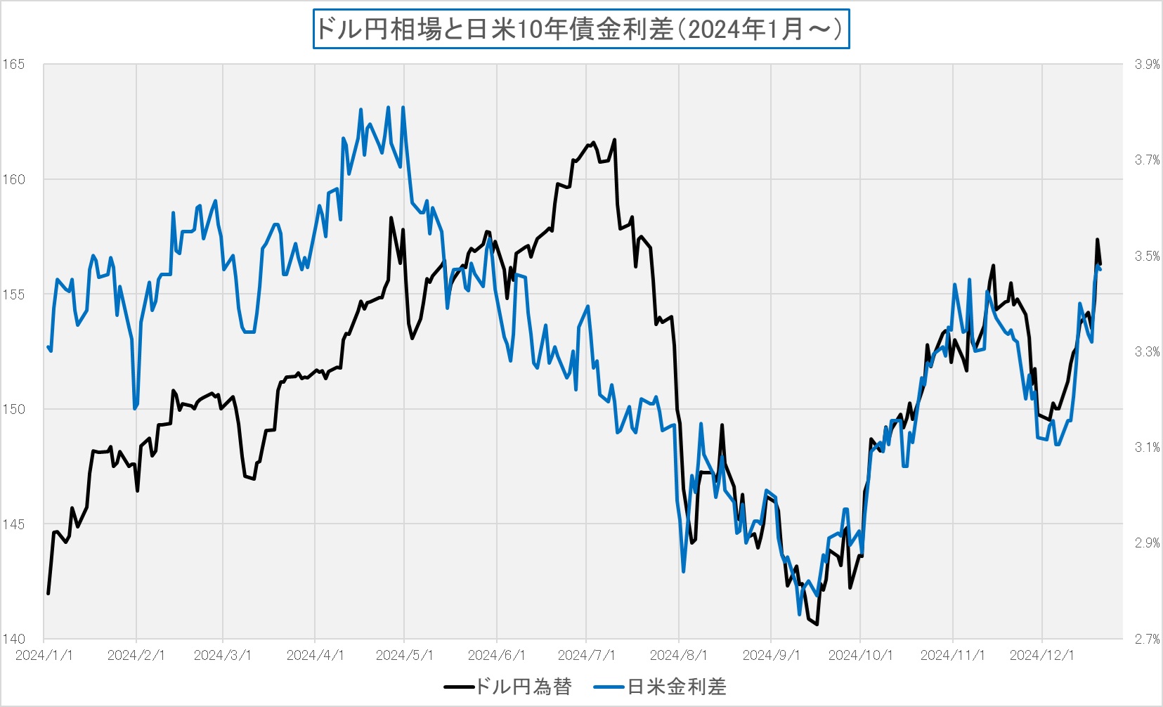 そこでもう1枚は、日米金利差とドル円相場の比較チャートだ。このチャートで見ても、やはり米国長期金利は上昇に芽があり、日本の長期金利は上昇する可能性は低いとすれば、やはりドル円相場の今後の展開は「円安方向」としか考えられない。但し、植田総裁の見解ではないが、まだ未知数であるトランプ次期大統領が正式就任されてからの動きは、何が起きるか予断は許さないだろう。