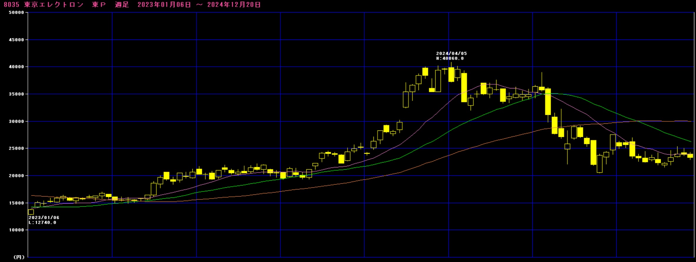 下にご覧頂くのは東京エレクトロン(8035)の2023年1月初めからの週足チャートだが、始まりが2023年1月6日に12,740円という安値があり、今年2024年4月5日には40,860円という3.2倍もの高値をつけた事跡が残っている。だが、その後は坂道を転がり落ちるかの如くに下落して、週末の終値は23,300円だ。高値から半値とまでは言わないまでも、57%の水準になるまで売られている。実は、こうした銘柄は探してみると案外日本株の中には多いことがわかる。