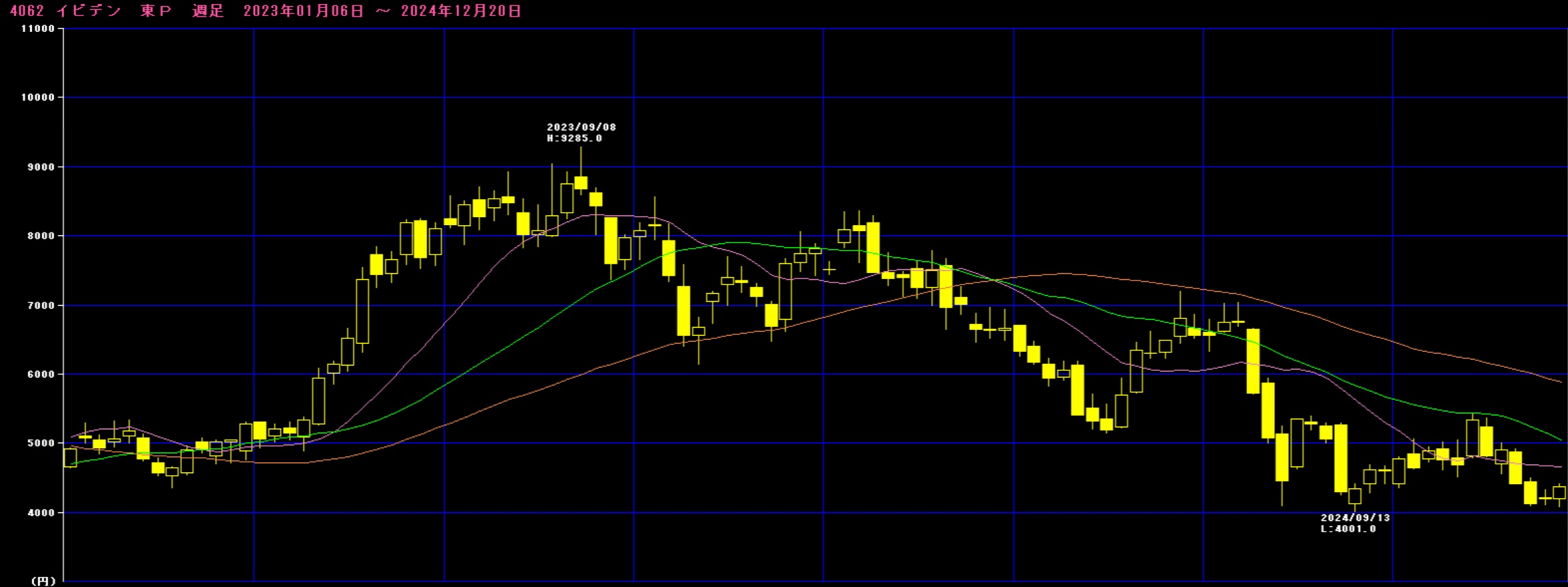 次に示すイビデン(4062)なども同様だ。高値は9,285円とあるが、先週末の終値は何と4,363円と、こちらは高値からの半値以下、約47%の水準に位置していることがわかる。