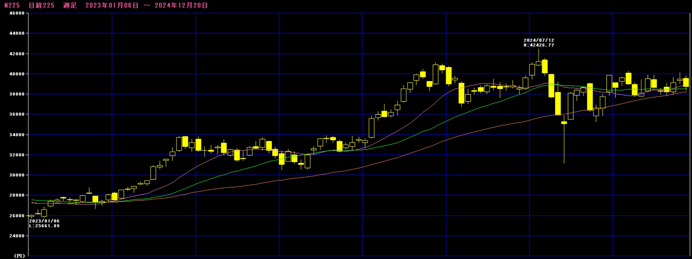 一方のこちら。これは同じ期間の日経平均株価の推移だが、高値は7月12日の42,426円だが、先週末の終値は38,701円と、高値の約91%の水準にある。