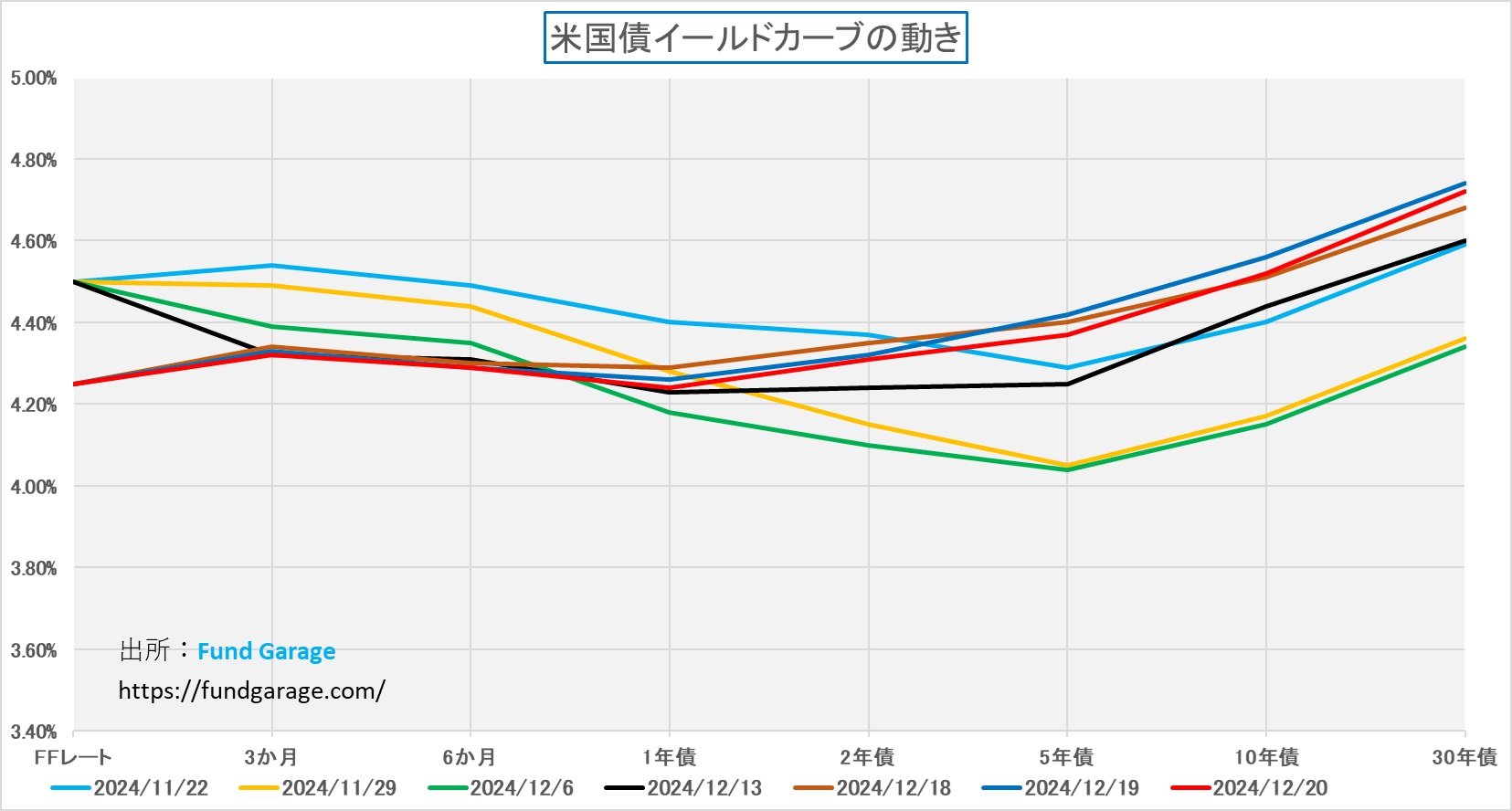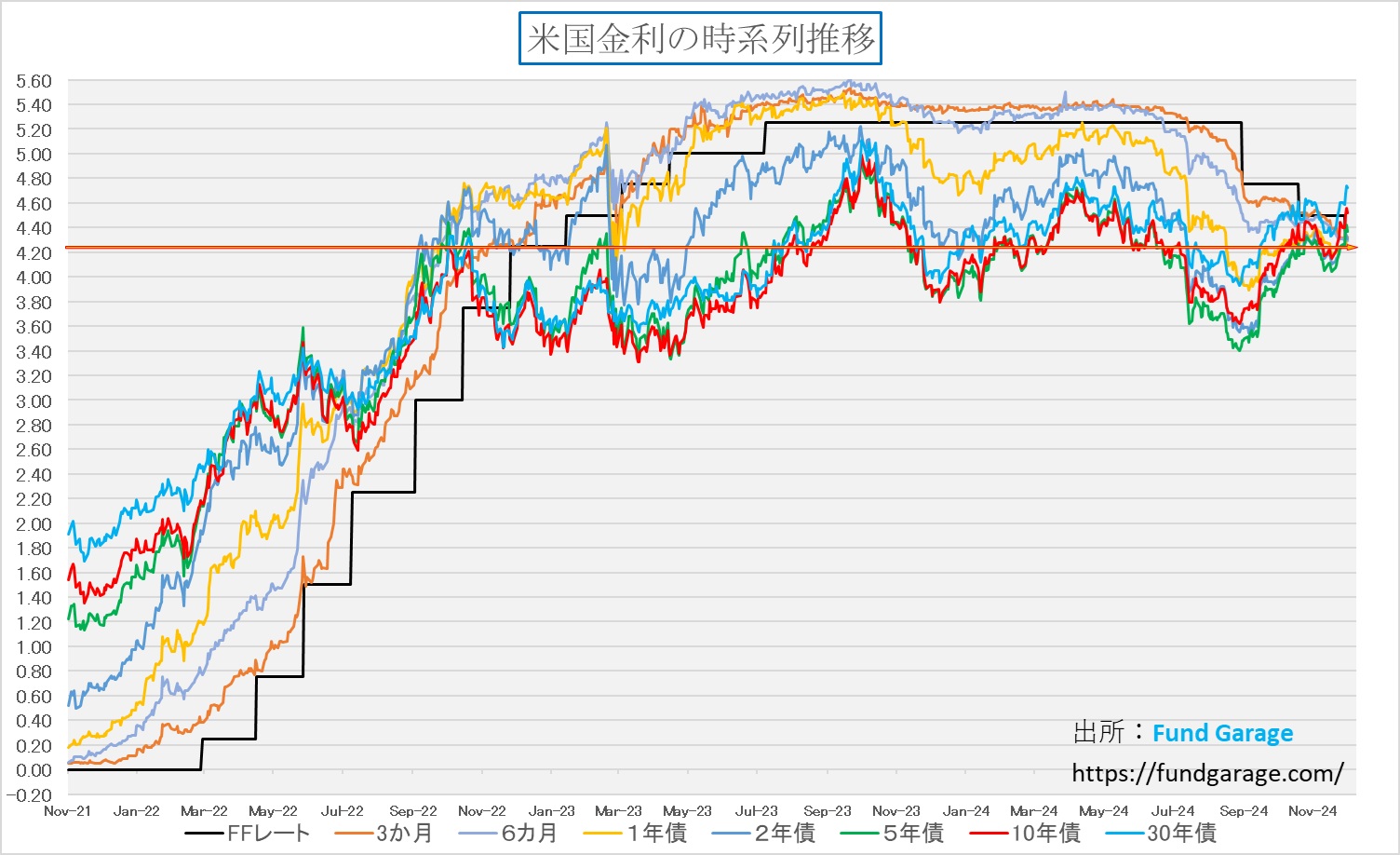 こうした見通しを反映してか、実は2022年7月から2年半の長き亘って続いた、米国金利の期間構造、すなわちイールドカーブの逆イールドカーブ状態が解消された。実際、この米国10年国債の利回り終値は4.51%。その翌日には4.56%、週末は4.52%で、明らかにFFレートの誘導目標である4.25%~4.50%よりも上方に位置するようになった。チャートでは下記の通りだ。