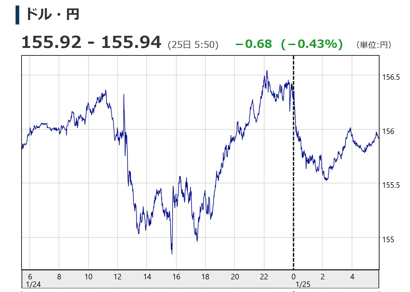 前週1月17日のドル円相場の終値は156.30円、そして第二次トランプ政権のスタート、そして日銀の0.25%の利上げを踏まえて、先週末の終値は156.00円。つまり30銭の円高で終わっている。為替市場は日本市場の取引終了後に置いても、当然の欧米市場で取引されているので、株式市場とは違って、日銀金融政策決定会合の結果を踏まえての価格形成がされて週を終えた筈だ。そして着地は僅か30銭だけの円高ということ。
