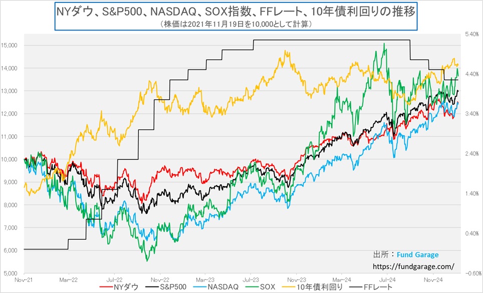 下のチャート、黄色い線が米国10年債利回りだが、2024年9月中旬、すなわちFRBが利下げを開始した頃に一旦3.65%前後まで金利低下した後は、順調に現状の4.62%程度まで上昇しているのが観察出来る。その下に緑、黒、水色、赤とあるのが株価指数のチャートだが、SOX指数こそボラティリティは高いが、それでも長期金利が金利上昇する中で、株価も堅調に上昇していることがわかる。もちろん、毎日の日々の値動きを細かく見れば、「金利上昇によって株価が下落・・・」というストーリーは正解でもあるのだが、多少長い時間軸に合わせてみてみると、株価は下げた分より上げた分の方が多く、結果的に金利上昇の中でも、株価は上昇していることがわかる。だからこそ、金利が上昇しても、企業業績が良ければ株価は上がる、ということが言えるのだ。FRBが現在利下げ姿勢にあるのは、パンデミック後のインフレ高騰を抑えるために、一気に利上げを続けたことによる修正局面だ。これは失われた30年を過ごし、デフレから脱却したい日本の置かれた状況とは180度異なるということは、ご同意頂けると思う。間違いなく、アメリカは景気が良い。一方で、日本は?という問い掛けに、「○○だから景気が良い」と言える人はどのぐらいいるのだろうか?またアメリカの大統領は、明確に「アメリカの黄金時代が今、始まる」と宣言したが、日本の首相は「楽しい日本」を目指と言われた。その楽しさの中には、経済的な明るさも含まれていることを願って止まない。