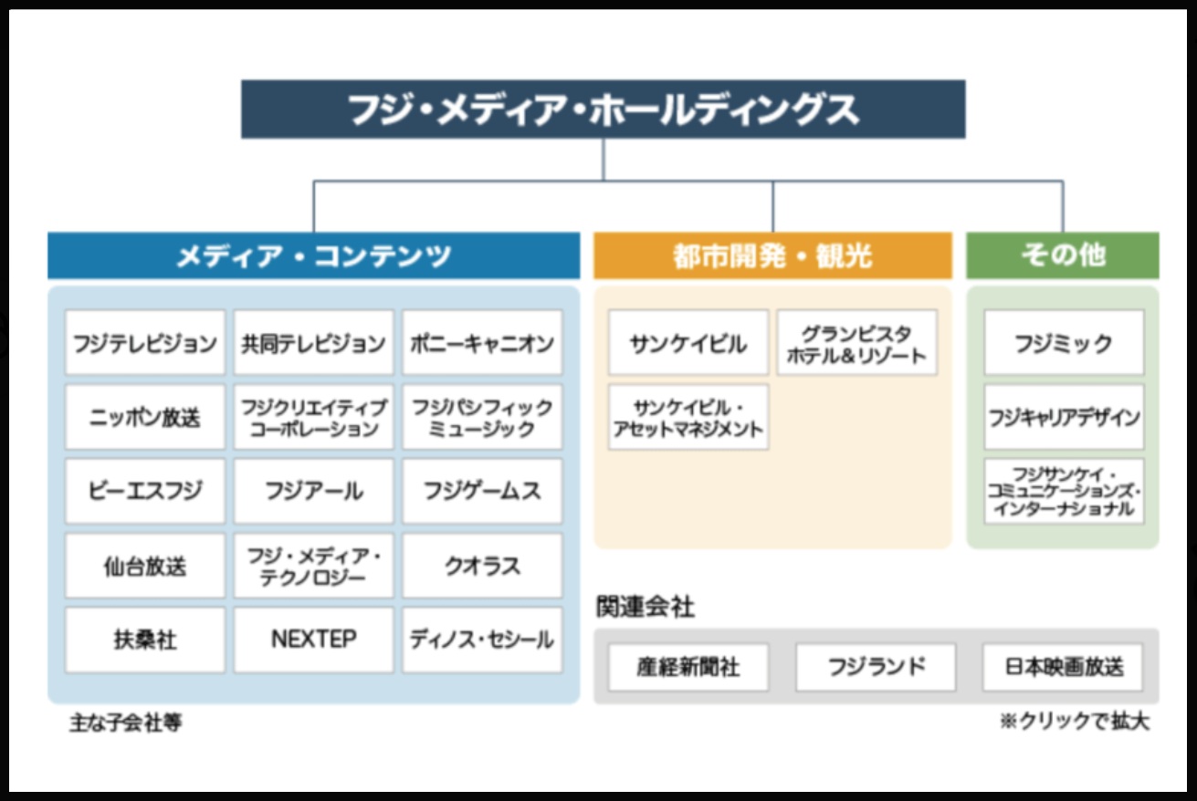 同じような文脈で言えば、今回のフジテレビの女性アナウンサーに関わる事案も、どこに真実があるのか、単に報道だけを観ていても分からない。他局がまともかと言えば、基本的に同じ業界のベクトルは同じ方向に向いているものであり、大同小異の可能性は高い。ただそんな事よりも、仮に今回の件で「フジテレビ」の社長が引責辞任を迫られたとしても、実は、本丸の話にはならないということをご紹介しておこう。そう、ホールディングスの下にぶら下がる会社というのは、現実には単なる「事業部」のひとつに過ぎないということだ。まあ、それにしても、あらためて調べてみると、あれも、これも、それもだったんですね。