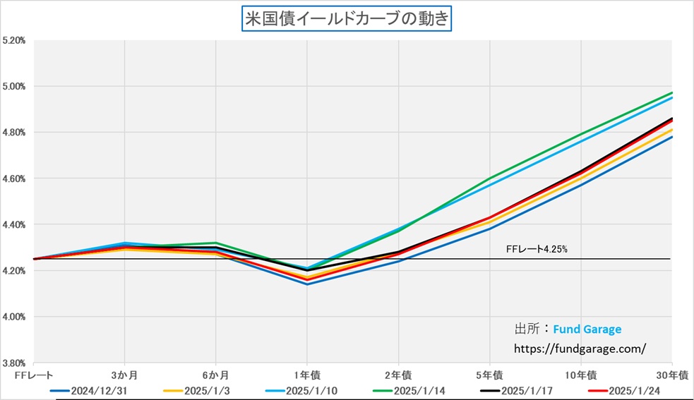 先週の米国市場では、1月の製造業PMIが予想を下回る弱い結果となり、景気減速の懸念が浮上した。また、トランプ大統領が対中関税強化を即座には実施しない可能性を示唆したことで、再度利下げ期待が持ち上がり、結局前週末1月17日の水準と殆ど変わらないレベルで債券市場は取引を終えている。従って、赤と黒のイールドカーブが殆ど重なって見える。イールド・カーブの中ほど、ちょうど期間1年のレベルが、このところいつでも一番低利回りとっているが、先週の終値は4.16%。直近でも4.15%を下回ったことは無い。