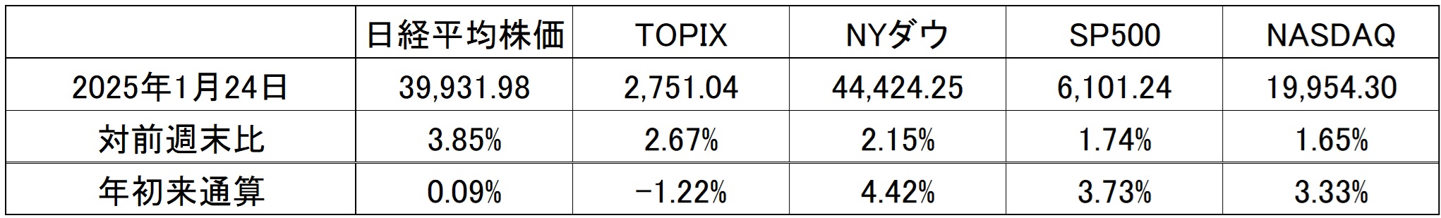 先週の日米株式市場の騰落率は下記の表の通り。投資判断を引き下げた日本株について、皮肉なことに日経平均がベストパフォーマンスとなっているが、この背景にあるのは、先週ホワイトハウスでトランプ大統領が発表された「Stargate project」であることは言うまでもない。また、少なからず、利上げをによる急落に備えた「売りヘッジ」の買戻しが、来週も月曜日も含めて行われるだろう。