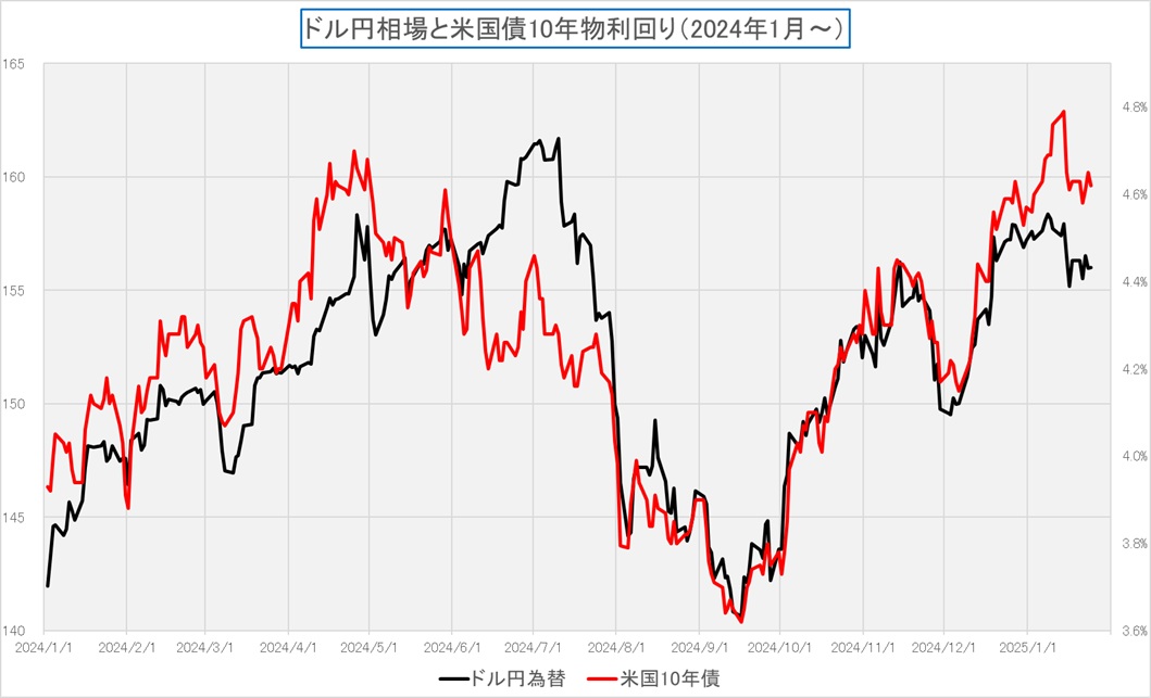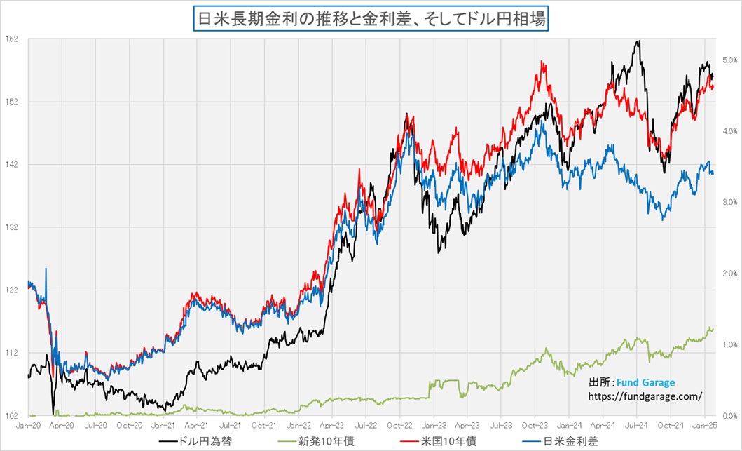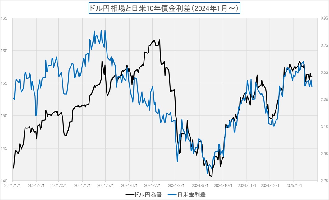 しかし、昨年12月のFOMCでFRBが0.25%の利下げを行って以降、その相関は米長期金利から短期的には再び日米長期金利の金利差へと変わったかに見える。ただ、足許の動きでは、金利差だけでも説明がつかない感じになってきている。米国10年債の利回りに相関するなら1ドル160円にはなっていてもおかしくない。とは言え、金利差に収斂するなら、155円でも問題ない。どうやら10年債利回りと金利差で綱引き状態になっているよう見える。ただ、どちらに転んだとしても言えることは、あまり円高の芽は無いということだ。