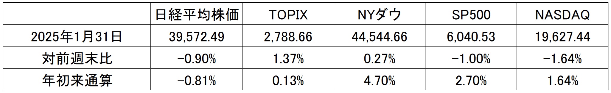 一言で先週起きた「DeepSeek問題」への私の捉え方を説明すれば、こういうことになる。勿論、何の確たる証拠もないが、状況証拠を繋ぎ合わせて、当然、技術的な背景や先週発表になった大手テクノロジー企業(マイクロソフト、META、IBM、アップルなど)の決算動向やその後のカンファレンスでの内容を踏まえた上で、また金融業界というドロドロした世界の裏側(言い換えると自己中心的強欲の塊)も考えれば、こう考えるのが最も妥当だと思う。正直、「DeepSeek」の創業者がヘッジファンドだと聞いた時、素直に「またか」と思った。そんな「DeepSeek問題」に振り回された、日米株式市場の先週の騰落率は下記の通り。NASDAQの週間騰落率と年初来騰落率が一見すると一緒だが、より小数点以下桁数を増やせば、週間騰落率が△1.6380%で、年初来騰落率が△1.6398%なので、計算間違いでは無い。更に付け加えると、フィラデルフィア半導体指数ことSOX指数の週間騰落率は△6.10%と抜きんでて悪いことがわかる。これらが「DeepSeek問題」の影響であり、恐らく、もう暫くはこの混乱は収まらないだろう。ただそうなったとしても、狼狽する必要は何処にもない。