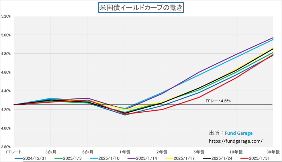 続いて見ておきたいのが、イールドカーブだ。赤い線で描いたのが先週末1月31日のイールドカーブだが、1年物が4.15%と一番低いところにあり、30年債の利回りの4.79%が一番高い。もしFFレートの誘導目標を0.25%の利下げ後の4.00%と仮定し、他の1年未満の金利も揃えるように補正することをイメージすると、イールドカーブはとてもきれいな順イールドにはなる。ただ、注意して貰いたいのは、Y軸のスケール。順イールドに見え易いように、Y軸の目盛りの振り方は最高値がかなり小さくしてある。実際一番上で5.20%なのだから。週末の10年債利回りは4.54%に過ぎないので、実際には絵で見るほどにはイールドカーブは立っておらず、フラットな状況に近い。ただ実際にこの先、トランプ大統領の「MAGA(Make America Great Again」政策が進むのであれば、間違いなく米国経済は強くなる。つまりイールドカーブはより立つ(スティープ化する)だろう。上のチャートを見て貰えば確かだが、通常、FFレートの誘導目標と10年債利回り、30年債利回りのスプレッドは2-3%の開きがあるのがヒストリカルな実績だ。だとすれば、年内0.25%の利下げが1度行われてFFレートの誘導目標が4%になったとしても、更に2度目が行われて3.75%にまで低下したとしても、長期金利が6%や7%近くなっても、おかしくは無いということがわかる。イールドカーブがどの位「スティープ」になるかは、その時々の景気実態を反映する以上、もし「アメリカの黄金時代」が再現されるなら、それなりに「スティープ」になってもおかしくないということだ。