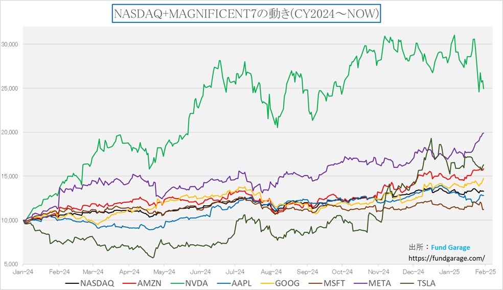 「King of AI」などと呼ばれることもあるエヌビディア(NVDA)だが、その株価運びはイメージされている以上にボラタイルだ。つまり「荒い」という意味。下のチャートは昨年2024年初めからのNASDAQとマグニフィセント7の株価運びを相対比較したものだが、絶対的なパフォーマンスがずば抜けていることも事実だが、その上下変動がかなり大きいことがわかる。マグニフィセント7のエヌビディア以外の銘柄を見ると、このところはメタプラットフォームズ(META)やアマゾンドットコム(AMZN)が緩やかに下値を切り上げているのも見て取れるが、アップダウンは穏やかだ。