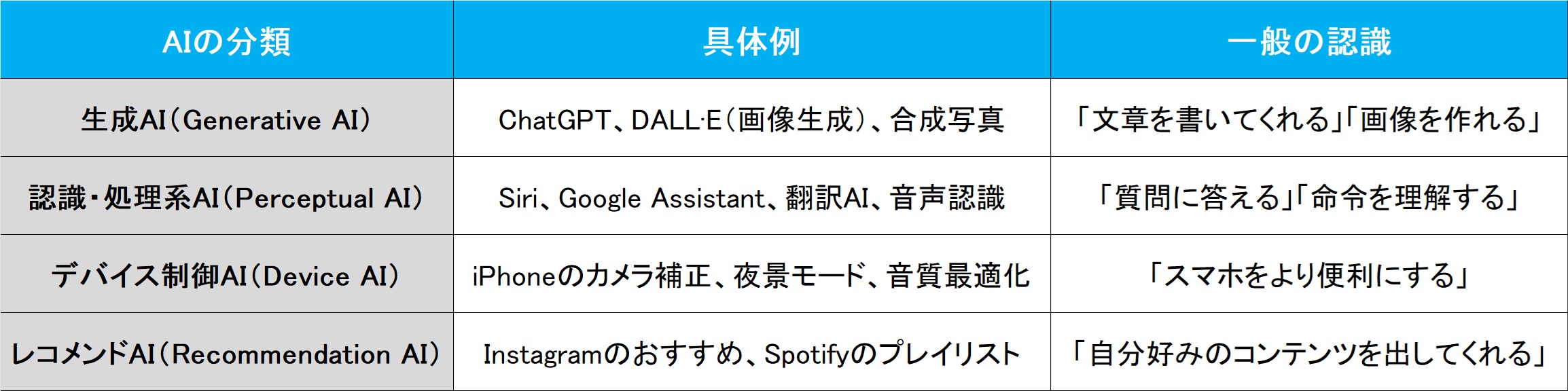 アップルの決算内容のポイントは、市場やメディアのネガティブな事前予想に反し、「Apple Intelligenceが本格展開前でも、iPhone 16シリーズが十分魅力的だった」という点にある。まず、その謎を解くには、「AIとは何か?」という一般的な理解を整理することが重要だ。つまり「AI」という同音異義のたぐいの整理だ。現在、AIという言葉が非常に幅広い技術や用途を指すため、人によって期待するものや関心のある領域が異なっている。炊飯器についているのもAIであり、アセットアロケーションを考えてくれると称するモデルもAIとしてセールスされており、一方で、まだ殆ど見る機会がないAgentic AIやPhysical AIといったものもある。だから特にスマートフォンにおけるAIの役割を考えると、どのような形でユーザーに価値を提供するのかを明確にすることが、技術の普及と市場での成功のカギとなる。当然、投資判断の糧にもなる。一般的に「AI(人工知能)」という言葉は幅広い意味を持つが、大きく分けると以下のようなカテゴリに整理出来る。