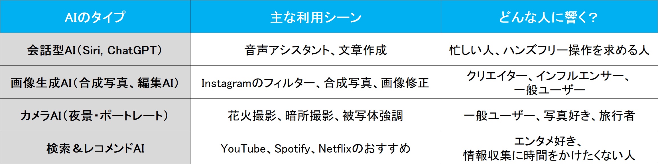 ならば、AIがどんな人にどんな形で訴求するのか、AIの利用形態によって、どんな感じのスマホ・ユーザーに響くかを整理してみた。