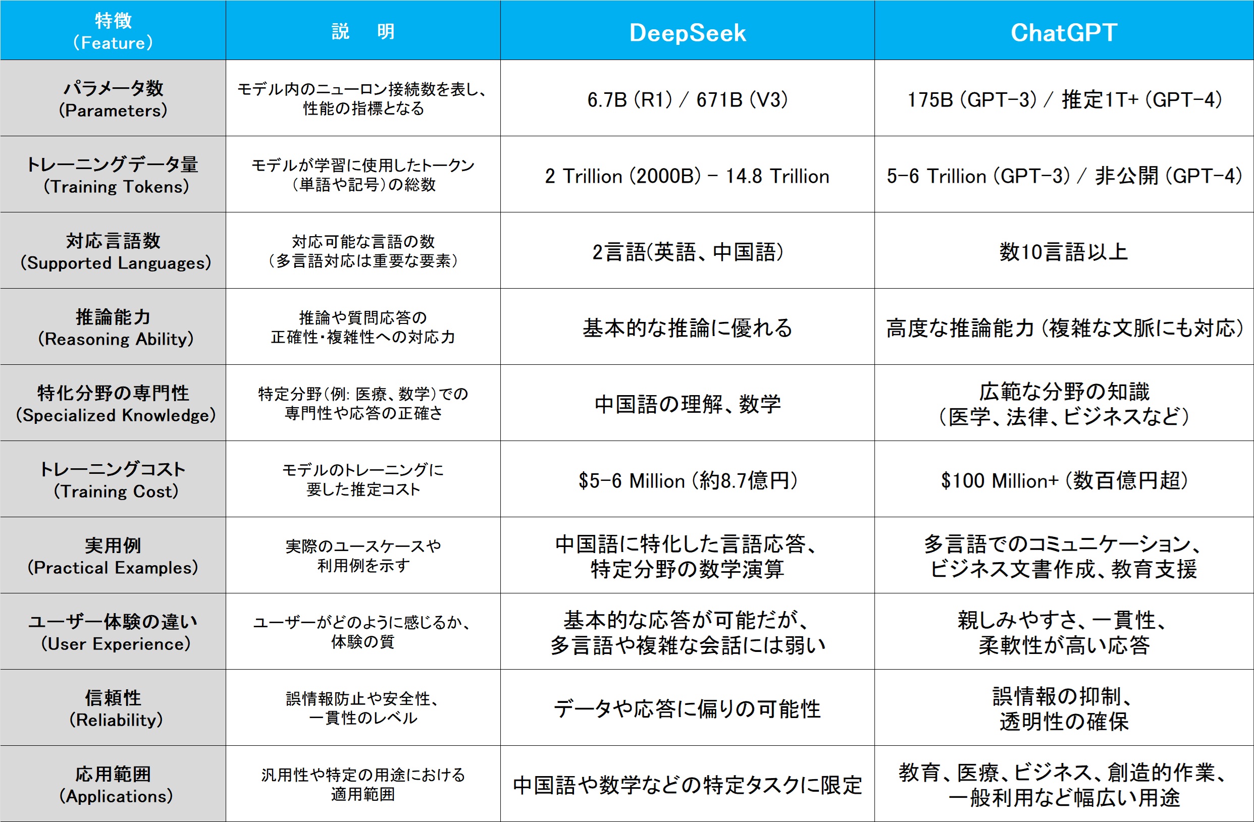下の表に、公表されている情報は少ないのだが、可能な限り調べてDeepSeekとChatGPTの特徴比較を行った。私が見る限り、結構な差があると思われる。