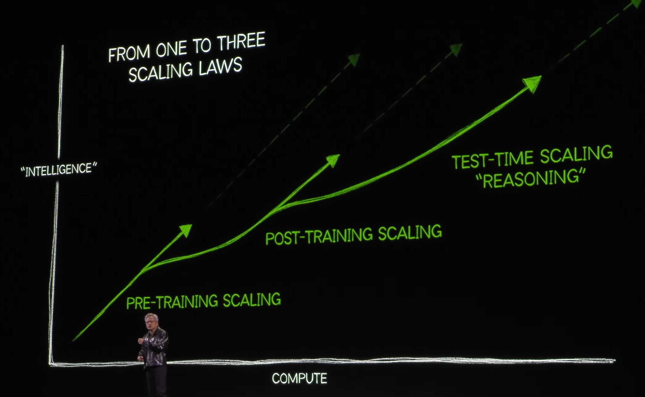 ということで、理解すべきは「Scaling Law」ということになる。おそらく、この点を理解しておかないとDeepSeek問題の勘所を見誤ると思われるが、実はこの「Scaling Law」に関しては、年初のCES2025の基調講演で、既にエヌビディアのジャンセンCEOが説明していることを思い出した。つまり「King of AI」のCEOは、既にいち早くこの状況を察知して、既に考え方を説明して布石を打っていたのかも知れないということだ。冒頭約21分程度が過ぎた、まだまだ序の口の部分で「Let’s talk about AI, Artficial Intelligence」と切り出して始めたのが、このAIの「Scaling Law」の話なのだ。