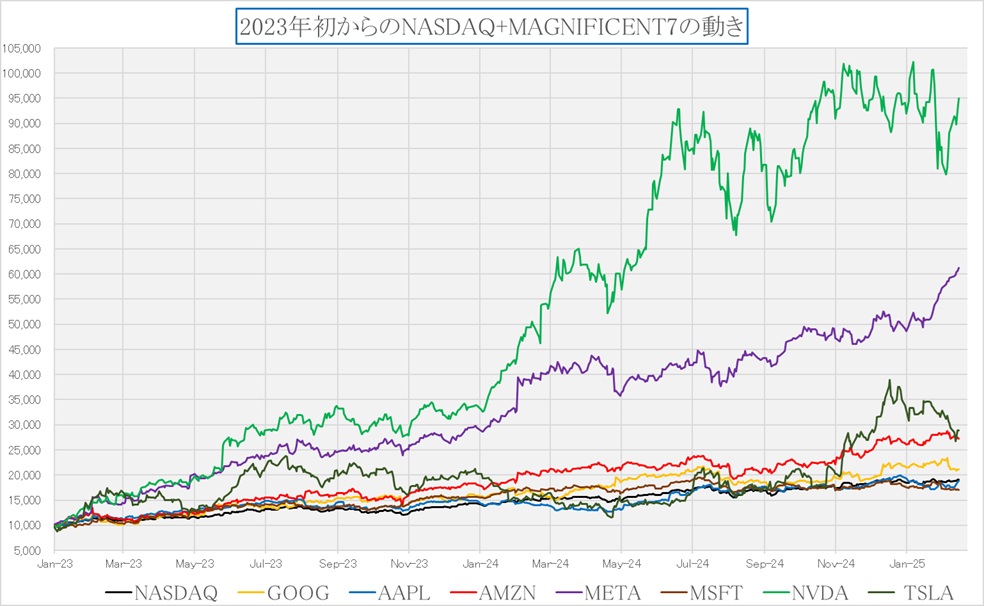 下のチャートは、2023年1月からのマグニフィセント7の株価変動を相対的に10,000をスタートポイントして比較したチャート。まずはこれをじっくり見て、考えて欲しいのは、投資家としての「欲」を、どうコントロールするかということであり、一般的な「世間話」のような「相場」の話と、正しい投資リテラシーは違うということだ。