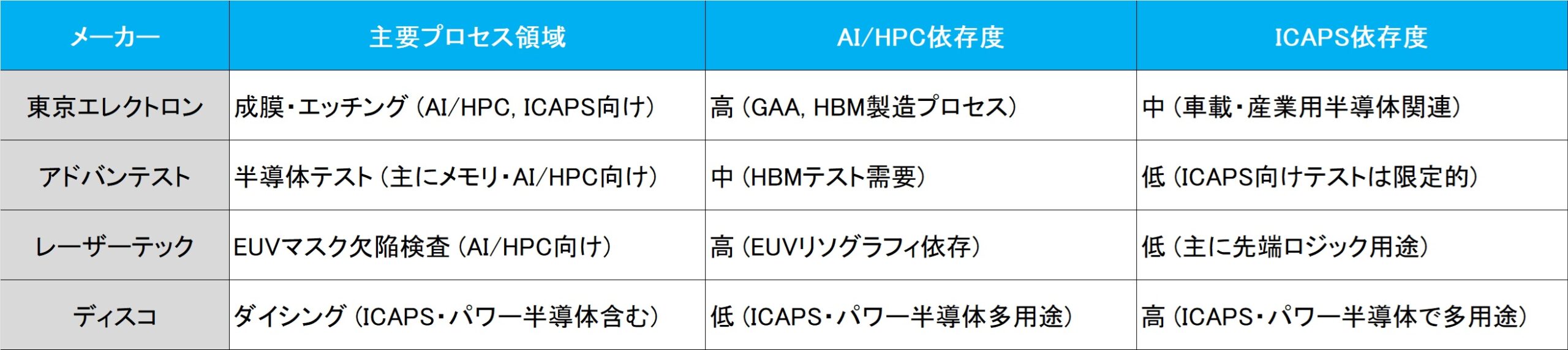 下記に日本の代表的な半導体製造装置メーカーの担当する主要なプロセス領域と、AI/HPCへの依存度、ICAPSへの依存度を考えた一覧表をお見せする。東京エレクトロンとレーザーテックはAI/HPC関連で強いポジションを持ち、ICAPS不調の影響は限定的だ。またアドバンテストはAI/HBMテスト需要があるものの、ICAPS向けは弱く、ICAPS低迷の影響は小さい。一方、ディスコはICAPS・パワー半導体分野が主戦場であり、ICAPS低迷は直接打撃となるが、パワー半導体分野の成長がカバーする可能性あるだろうとザックリとは考えられる。つまり、ICAPS低迷は確かにディスコなどには痛手だが、AI関連のGAA・HBM需要で東京エレクトロンやレーザーテックには強気の構えと言えるかも知れない。