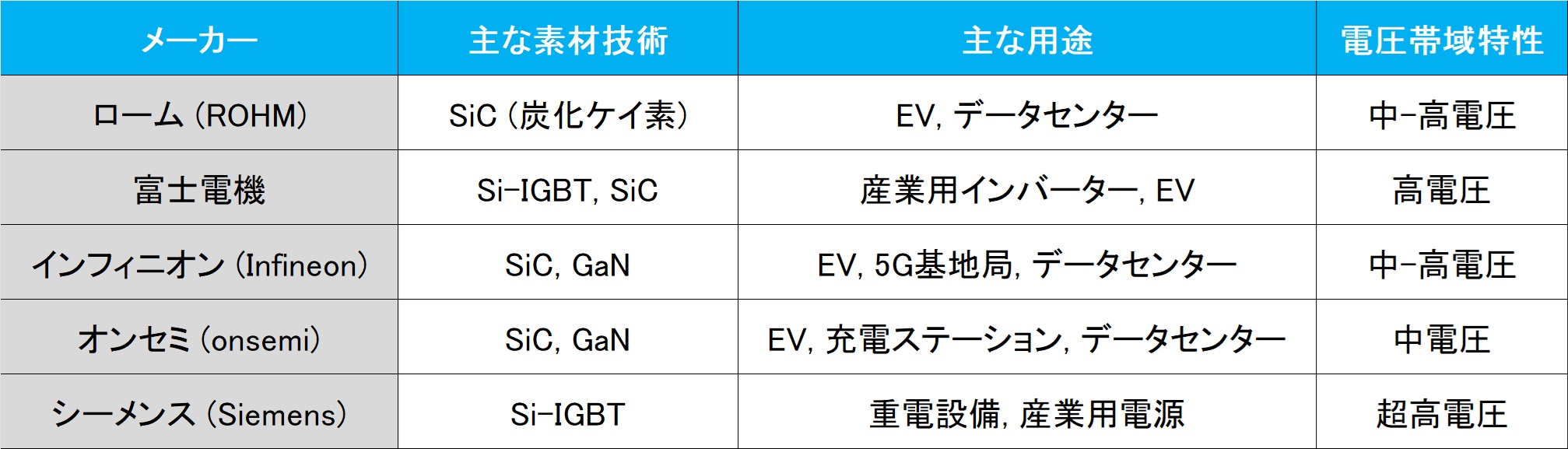 下の表は、所謂「パワー半導体」について、話題になり易い企業名と、主な素材、主な用途、そして電圧帯域特性を整理してみた。