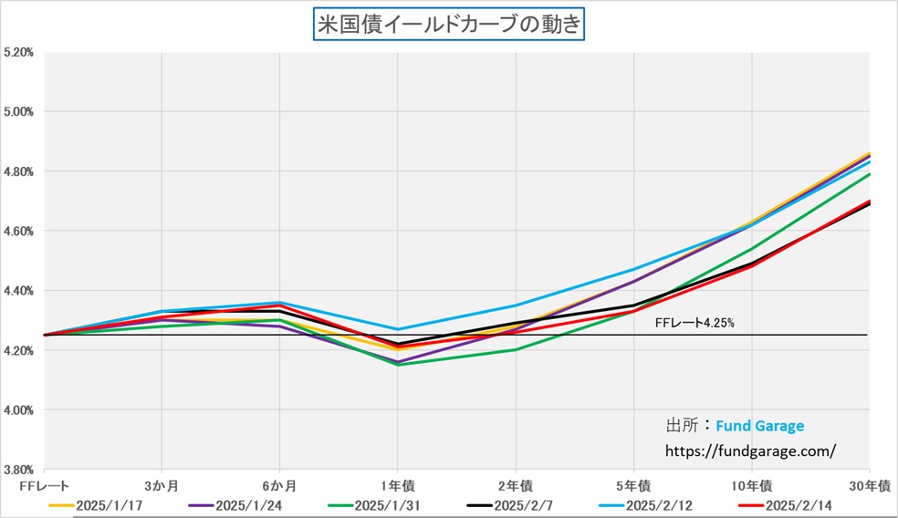 トランプ大統領の就任直後、一旦はスティープ化したイールドカーブではあったが、その後、FOMCでは利下げが無く、またパウエル議長の議会証言でも「焦って利下げする状況では無い」という発言もあったこと、物価インフレ動向、雇用市場動向など、全てが慌てての利下げを示唆するものではなく(予想通り)、年内の利下げ回数は1回あれば充分かも知れないというトーンに変わったことで、イールドカーブの形状は構築された。