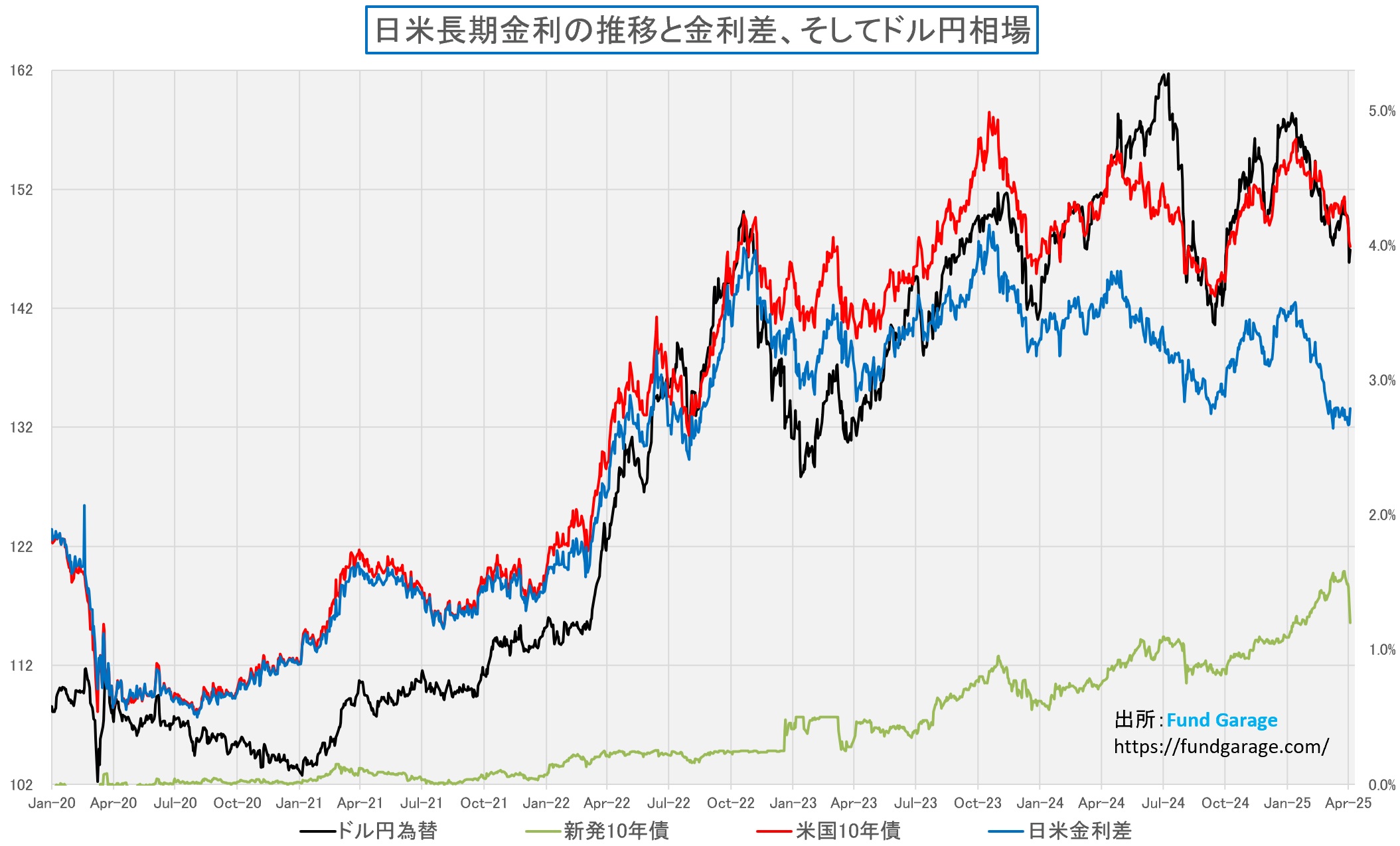 ベッセント財務長官は、「強いドル政策を維持する」と明言した。これはドル安誘導の懸念を払拭する発言として評価されるべきだが、国内では「円高の芽が出てきた」との声も出始めている。だが、冷静に考えれば、米国が強いドルを維持し、日本が利上げを見送る限り、金利差は維持され、為替相場は円安基調が続く公算が大きい。植田日銀総裁が「金融政策の正常化」を語ることはあっても、現実にそれが可能な経済環境ではないことは、もはや明白である(そんなことはなく、日本の景気は利上げに耐えられる程に強いという人もいるであろうことは、承知しているが・・・)。「正常化」という言葉自体が、実体経済に基づくものではなく、中央銀行内の“官僚的な規範維持意識”にすぎないという厳しい現実に、投資家は向き合うべきである。下のチャートが示す通り、漸く日本の長期金利も低下し始めた。これは日本の景気実態をリアルに受け止めた市場反応と見ることも出来る。週末現在の日本の10年債利回りは1.200%まで低下した。