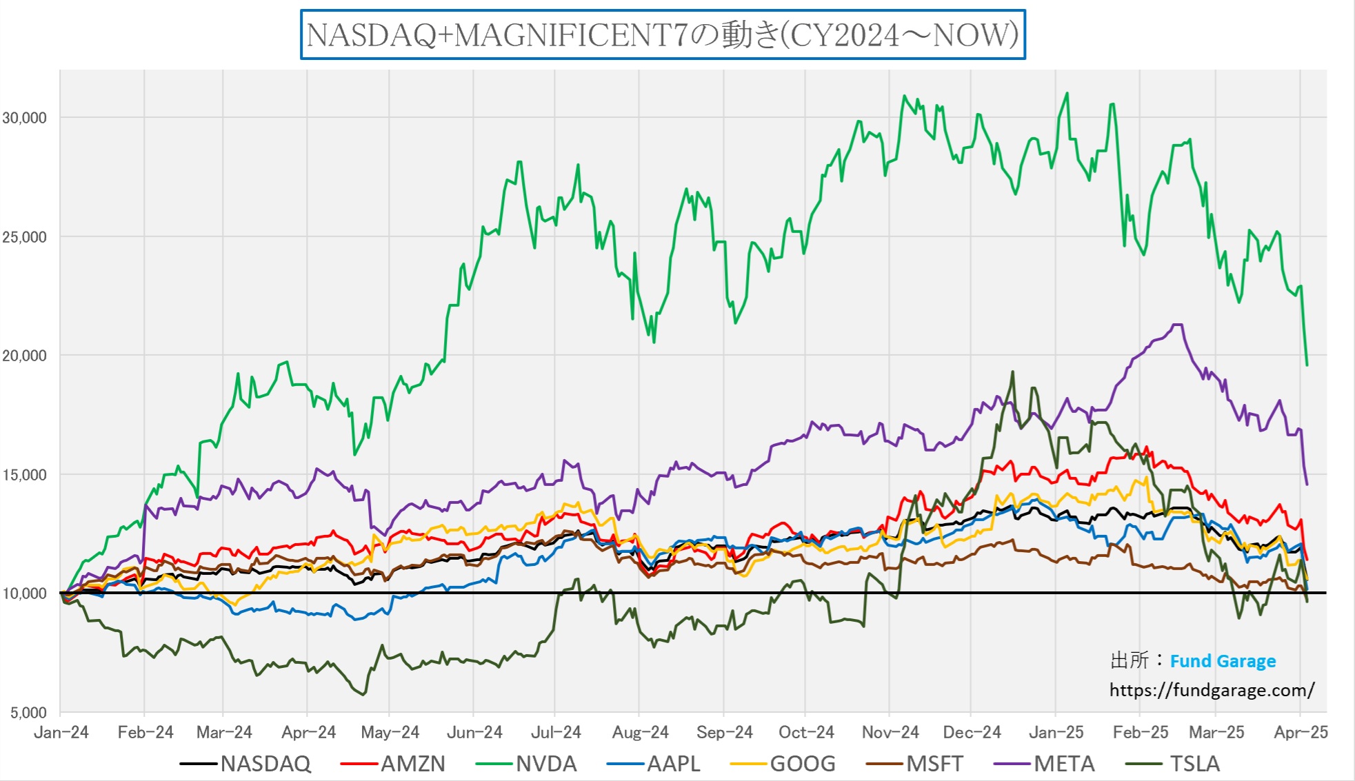 もちろん目先の株価の上げ下げだけを捉えるならば、2025年に入ってからの米国株式市場の動きも、芳しくはない。一部の銘柄に資金が集中していた、すなわちマグニフィセント7だけが株価を牽引していたのが「悪」というロジックは、筋が通っても聞こえる。だが、投資家はどの程度の期間を見て、株式投資をしているのかという論点が欠けているように思われる。下に示すチャートは、2024年初めからのマグニフィセント7とNASDAQの相対比較チャートだ。横一直線の線がNASDAQとして、それよりも上にあれば、プラスのパフォーマンス、下にあれば、マイナスのパフォーマンスということを意味している。ご覧頂ける通り、この一年あまりという短い期間ではあるが、この間を切り取って比較して、NASDAQを下回っているのは、マイクロソフト(MSFT)と、テスラ(TSLA)の二銘柄だけであり、それも△3.00%と△3.46%に過ぎない。逆に、エヌビディア(NVDA)は現在でも+95.79%、メタプラットフォームズ(META)は+14.75%だ。繰り返すが、これは僅か正確には1年と3カ月のものだ。