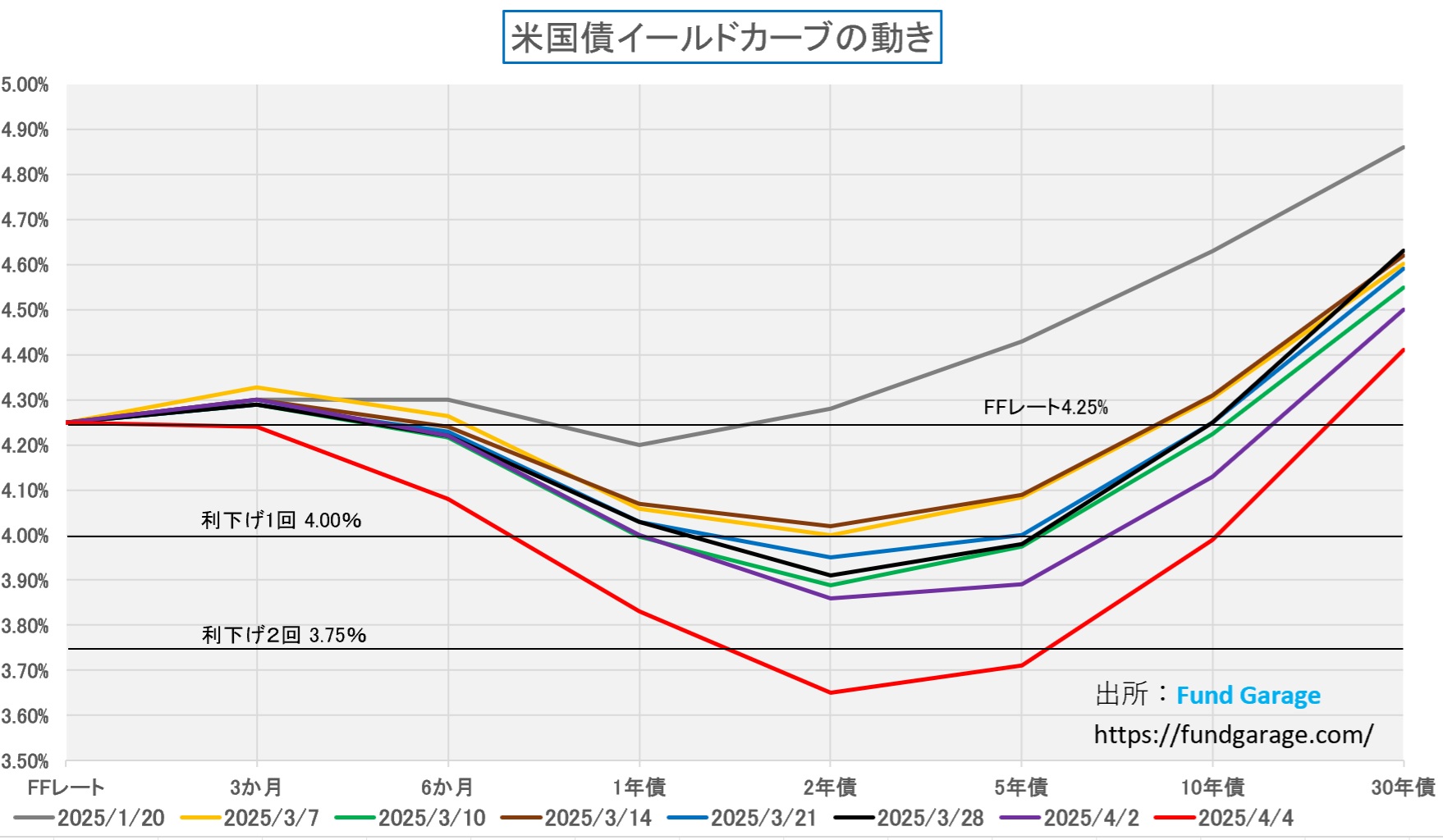 よくイールドカーブの動きを説明する時に、鉛筆や定規の片側の端を持って、目の前で上下に揺らした時の動きをもって説明する時があるが、このイールドカーブの形状は、長い方はあまり動いていないことがわかる。ただ、短中期だけは「4回の利下げを織り込む」と言われるほどにまで低下している。だが、パウエル議長は「利下げの必要性を今は見ていない」という。さて、ここからがパズルと推理だ。つまり、やはり冷静な投資家は米国景気の中長期的な見通しは、足許の不確実性を乗り越えた後は回復すると読んでいるとも考えらえる。勿論、インフレ襲来で、長期金利が上がることを織込んでいるんだというロジックもあり得る。ただ、私は今回の関税もMAGAが根底にある以上、またトランプ大統領は常々「金利は低い方が良い」と言っている以上、足許の不確実性を乗り越えたあとの米国景気の状態を想定して、長期金利の低下は抑えられていると読む。