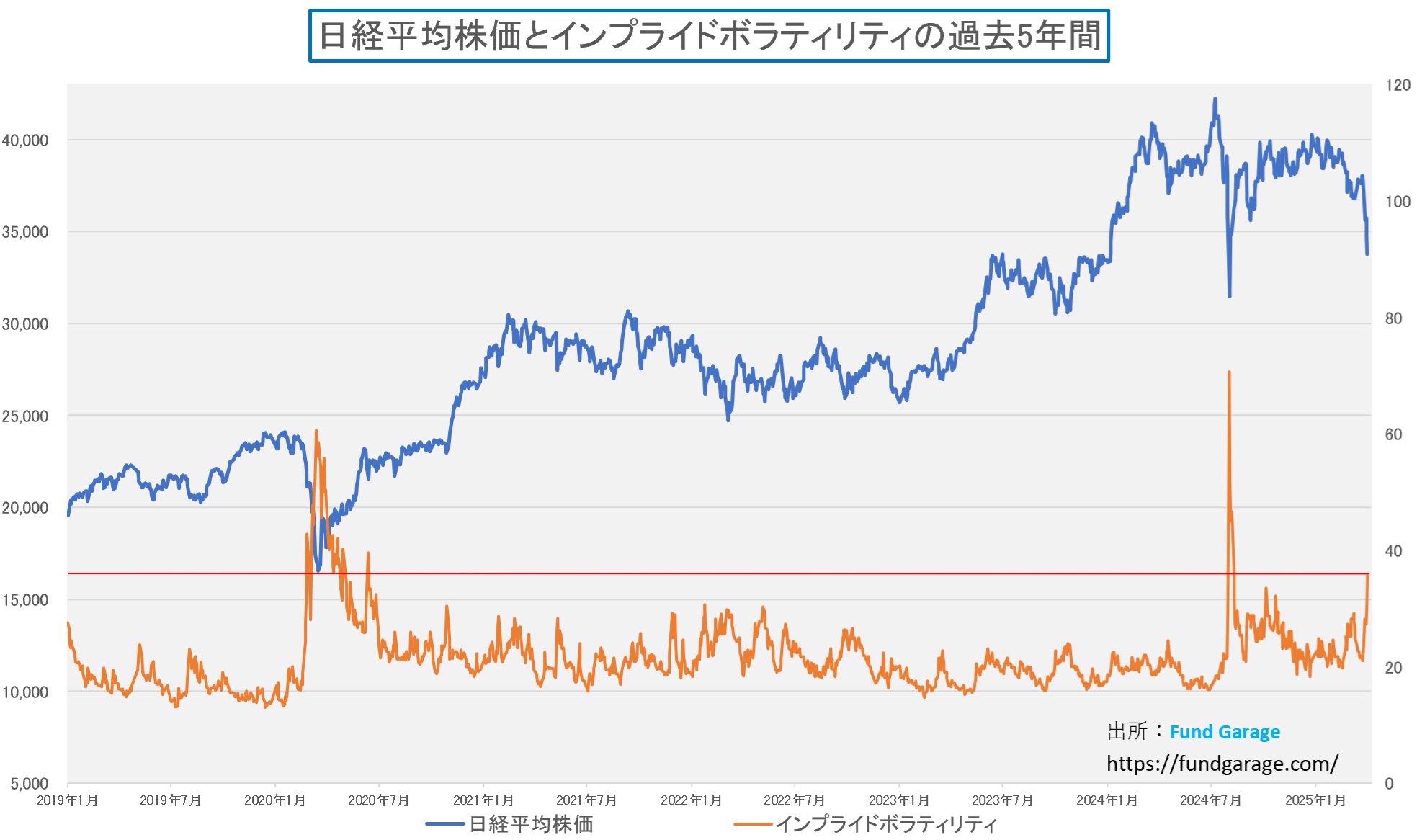 ならば、日本市場はどうかと言えば、さすがに日経平均のインプライドボラティリティもかなり急騰したことが確認出来る。ただ、残念ながら、昨年8月のピークにまでは届いていない。つまり現時点においては、日本市場ではまだ、「米国景気のスタッグフレーション」という”他人事”に捉えているのかも知れない。ただ明らかなことは、この数値は、先週末までであり、金曜日にNY市場が急落した事実を織込む前だということ。週明け、月曜日の時点で日経平均が急落するようなことになれば、自ずとこの数値も上昇するだろう。