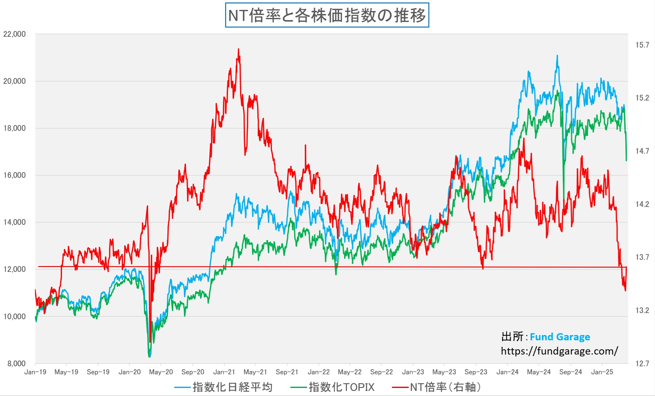 更に言えば、PERの議論も無視され易いのも日本株市場の特徴だ。上のチャートは先週末までの日経平均株価と予想PERの推移。ご覧頂ける通り、予想PERは13.67倍にまで低下したが、市場を覆うセンチメントは「来週も株価は下がるだろう」というネガティブなものの方が強い。だが、下のチャート、すなわちNT倍率のチャートでも確認出来るが、既にその水準もかなり低くなり、寧ろ先週末はTOPIXが売られることで、NT倍率は上昇したぐらいだ。その背景にあるのは、日銀が利上げ出来なくなったということで、長期金利が急低下(前述)、その為、長短金利差の拡大に伴う利鞘の拡大を期待して急騰していたメガバンクなどの株価が急落したからだ。利上げは、日銀から提供される日本の金融機関へのボーナスともいえる。事実、利上げ幅ほどに普通預金の金利は上昇していないのだから、それだけでも利鞘が増えていることは誰でも知っている。