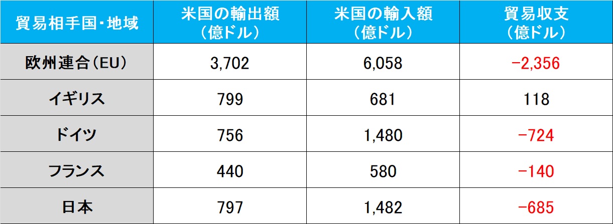 そして次が対米の貿易収支の表だ。これをどう読み解くかは、ある意味では個々の投資家の自由だが、米国側が「“利益を享受しながら返礼がない”貿易構造」と考えるには一理あるのは事実だ。特にドイツのそれは著しいと言える。