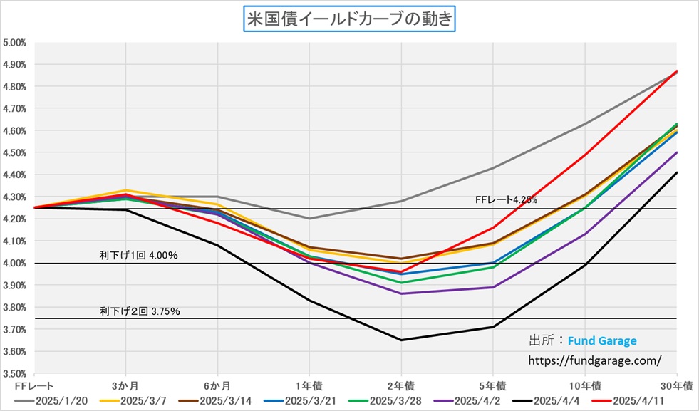 このチャートはトランプ大統領がホワイトハウス入りした1月20日からのイールドカーブの推移だ。当然のことながら、4月4日の市場センチメントは最悪であり、イールドカーブは年3回とも4回とも言われる利下げを織り込むほどに短期金利が低下した(黒線)。