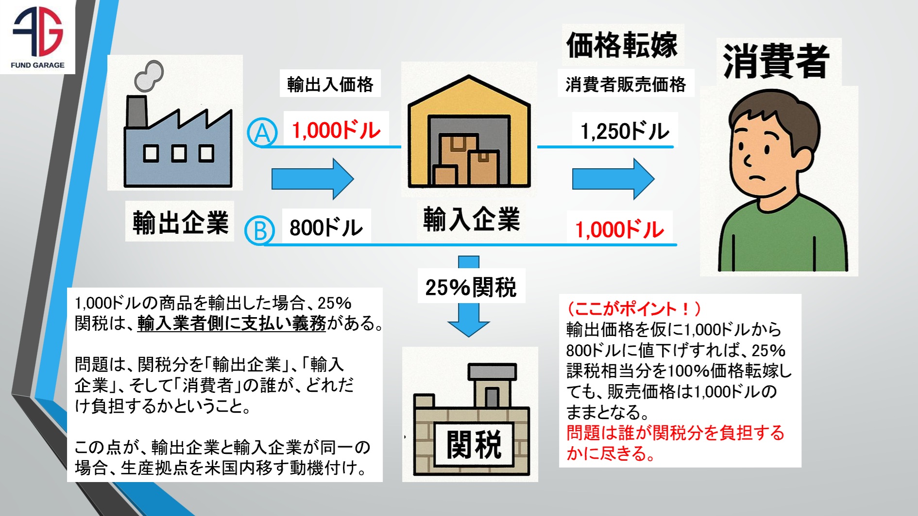 実際には、1,000ドルの商品に25%の関税を課すのではなく、輸入業者が「関税込みでも採算が合う価格で買う」ように交渉する。つまり、輸出側が800ドルまで値引きしてくれれば、関税200ドルを支払っても1,000ドルに収まる。この構造こそが、関税の本質を理解する上で重要なポイントである。