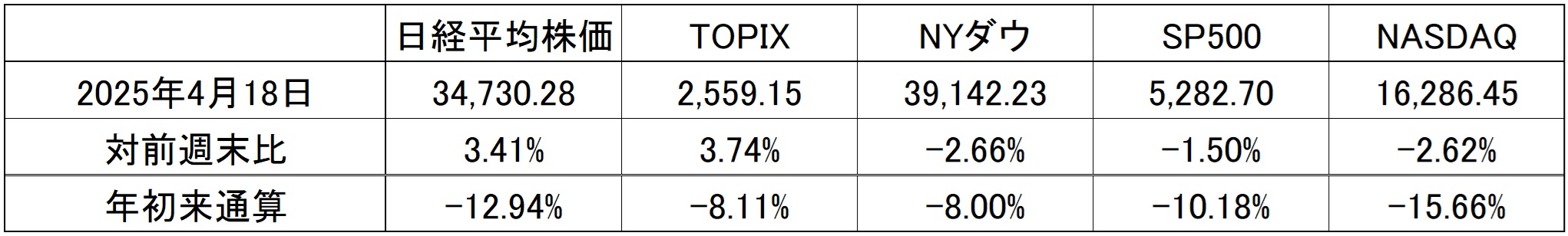まずはいつもの週間騰落率と年初来騰落率の表だ。ご覧の通り、日本市場は好調を維持し、米国市場は引続き揺れている。その背景にあるのは、半導体関連の相互関税の取り扱いとは別に、エヌビディアの中国向けGPU(H20)の実施的な輸出禁止が発表されたことが大きい。
