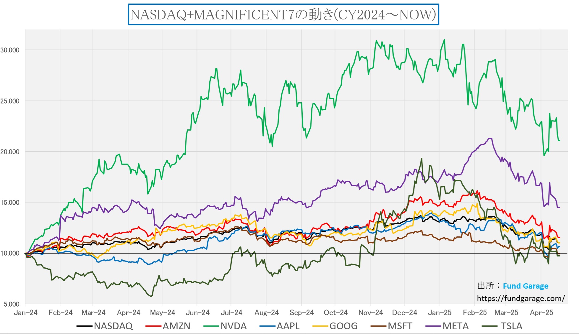 そして最近は一時の熱狂的な、猫も杓子もといった「肩入れ」が嘘だったかのように離散した「マグニフィセント7」への人気と、NASDAQの動きだ。「株式投資は長期投資」と言っても、短期の値動きに一喜一憂される方が多いのは事実。なので、次のチャートは昨年2024年初めからの株価推移を見ているが、この期間でマイナスになっているのは、足許でマイクロソフト(MSFT)と、テスラ(TSLA)の二銘柄に過ぎない。また「マイナス」と言っても、前者が△0.83%、後者が△2.84%に過ぎない。いや、「高値からの下落率の問題だ!」と言われるかも知れないが、僅か1年4カ月足らずの間にこれだけの変動率(リスク)で動いているのだから、ポジションを取るタイミングによっては、マイナスにもなるだろう。「いつ、どこで買っても、その後はプラスを維持どころか急騰する」なんてことは、リスクとリターンのトレードオフの話を持ち出すまでもなく、有り得ない話だからだ。ただ、それでも近時は掌を返したような悲観論が飛び交い過ぎていると思う。